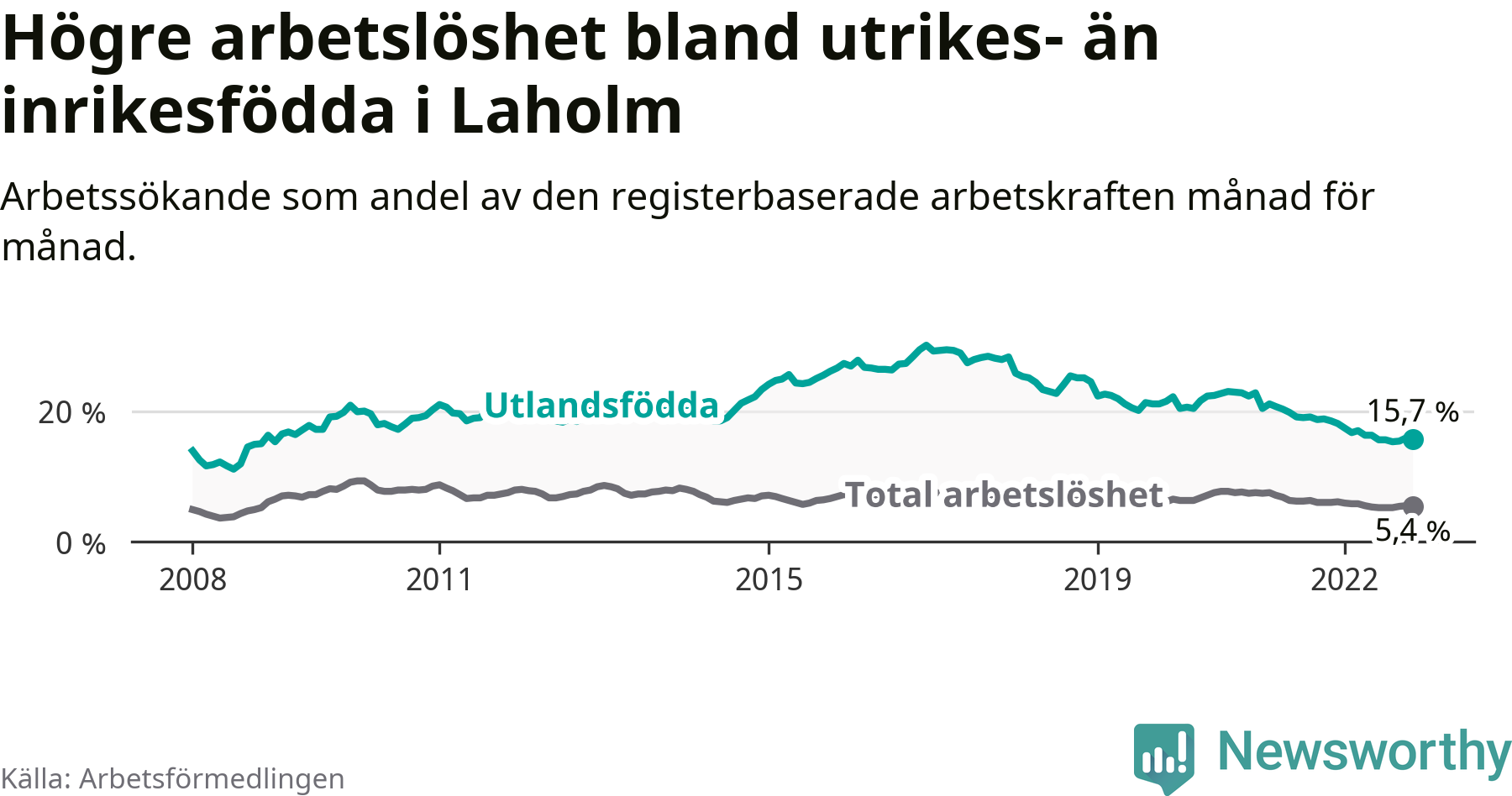 Skillnaden i arbetslöshet mellan utrikesfödda och hela befolkningen är 10,3 procentenheter i Laholm. Det är en betydligt mindre skillnad än för ett år sedan (−2,2 procentenheter).
