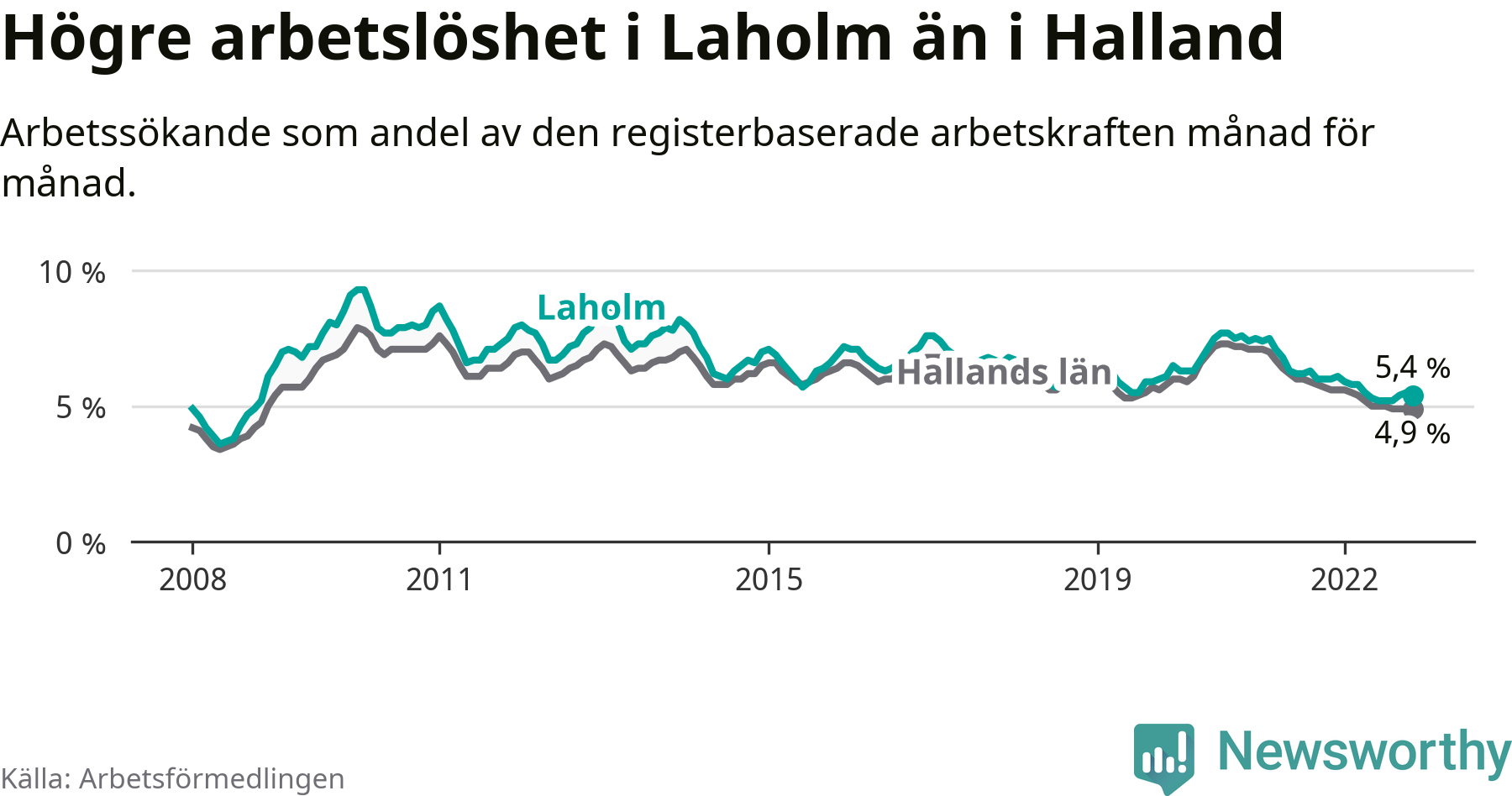 Även om arbetslösheten i Laholm alltså minskar, så ligger den fortfarande över snittet i hela Hallands län (5,4 procent i kommunen, jämfört med 4,9 procent i hela länet). Kungsbacka har den lägsta arbetslösheten i länet (2,6 procent), medan Hylte har den högsta (7,9 procent). För att Laholm skulle komma ner i samma arbetslöshetsnivå som Kungsbacka skulle 334 personer behöva sysselsättas.