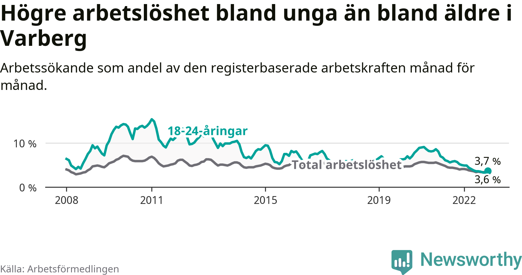 I och med den senaste månadens nedgång har de ungas arbetslöshet i Varberg sjunkit 20 månader i följd (ner från 7,0 procent i mars 2021 till 3,7 procent nu).