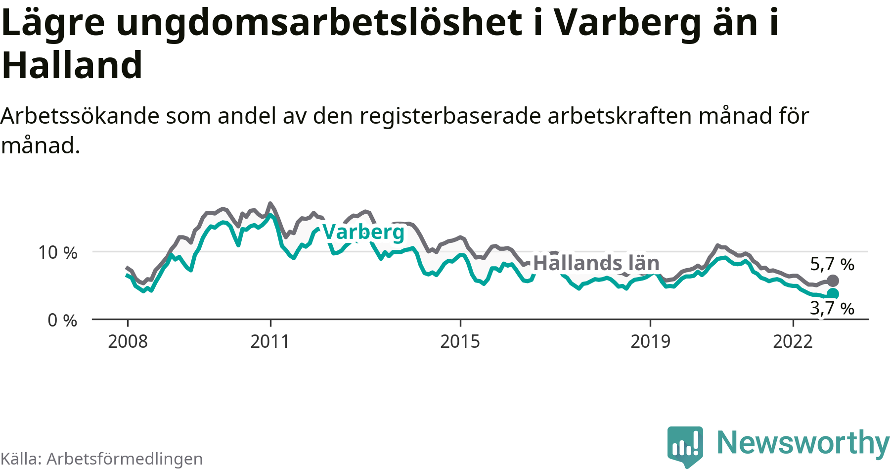 Precis som den totala arbetslösheten ligger ungdomsarbetslösheten i Varberg lägre än i Halland som helhet. Skillnaden mellan kommunen och länet är 2,0 procentenheter.