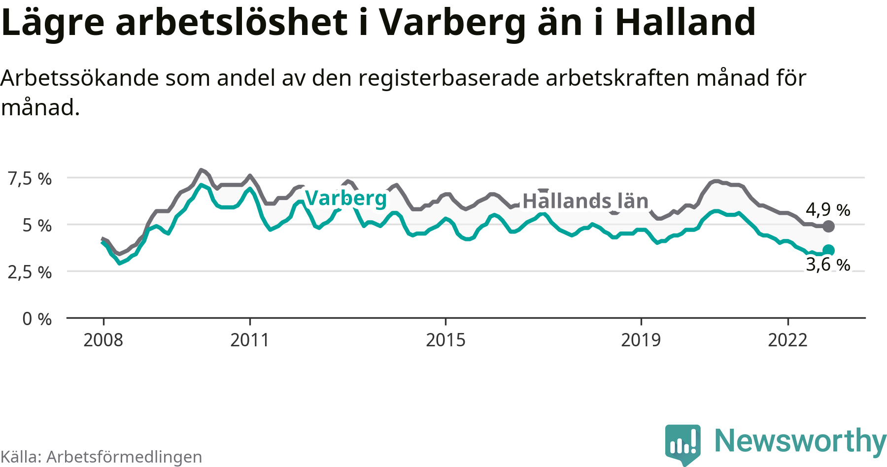 Varberg hade redan tidigare lägre arbetslöshet än snittet i hela Hallands län och nu växer klyftan (3,6 procent i kommunen, jämfört med 4,9 procent i hela länet). Kungsbacka har den lägsta arbetslösheten i länet (2,6 procent), medan Hylte har den högsta (7,9 procent). För att Varberg skulle komma ner i samma arbetslöshetsnivå som Kungsbacka skulle 313 personer behöva sysselsättas.