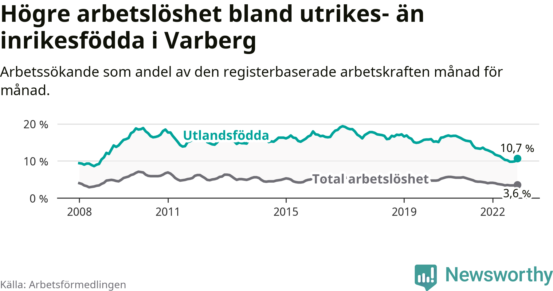 Skillnaden i arbetslöshet mellan utrikesfödda och hela befolkningen är 7,1 procentenheter i Varberg. Det är en betydligt mindre skillnad än för ett år sedan (−1,8 procentenheter).