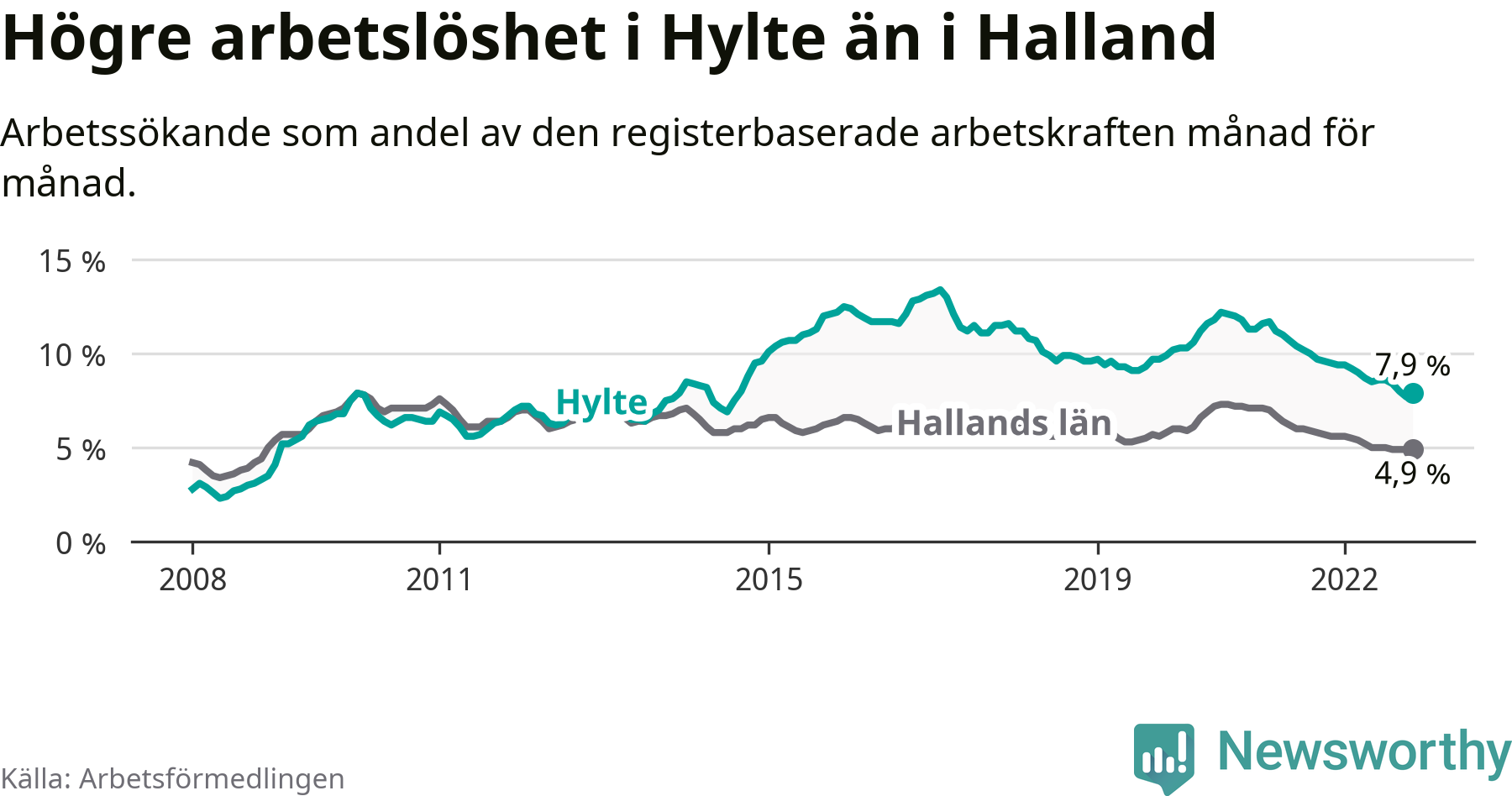 Även om arbetslösheten i Hylte alltså minskar, så ligger den fortfarande över snittet i hela Hallands län (7,9 procent i kommunen, jämfört med 4,9 procent i hela länet). Hylte har därmed även den högsta arbetslöshetsnivån i länet. Kungsbacka har den lägsta (2,6 procent). För att Hylte skulle komma ner i samma arbetslöshetsnivå som Kungsbacka skulle 256 personer behöva sysselsättas.