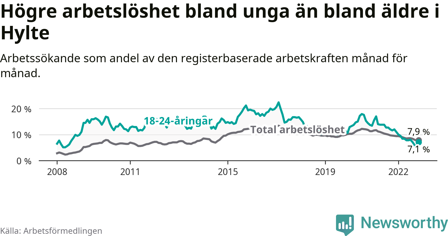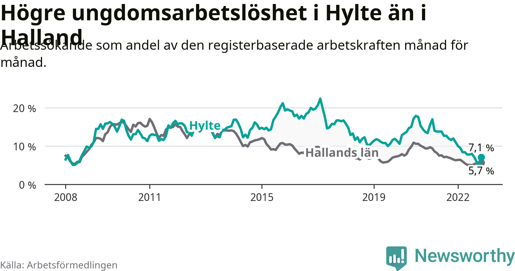 Precis som den totala arbetslösheten ligger ungdomsarbetslösheten i Hylte högre än i Halland som helhet. Skillnaden mellan kommunen och länet är 1,4 procentenheter.