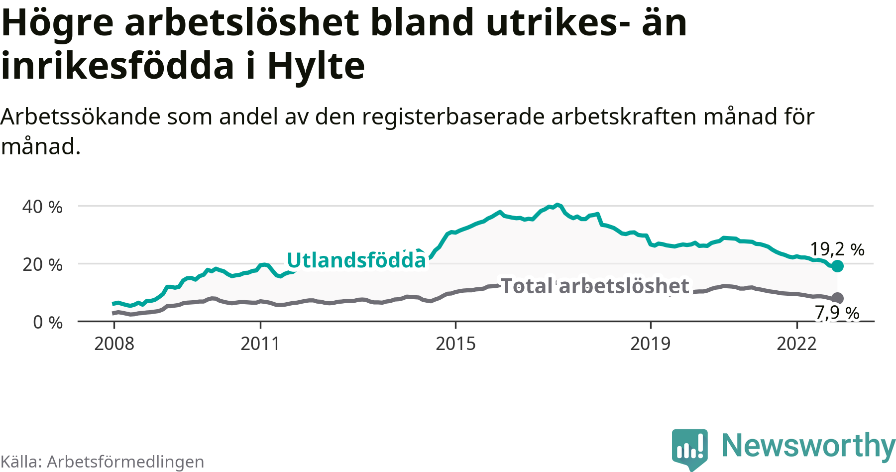 Den här skillnaden i arbetslöshet mellan inrikes- och utrikesfödda är ändå förhållandevis liten i Hylte om man jämför med andra kommuner i Halland.