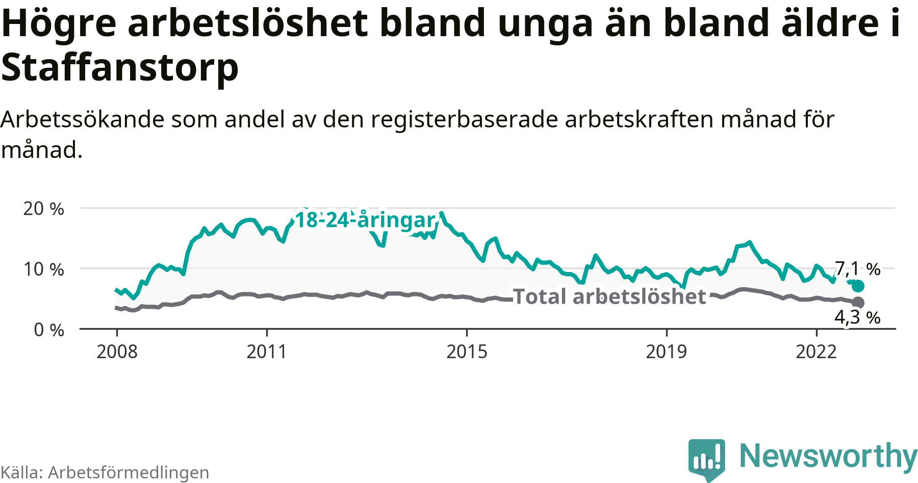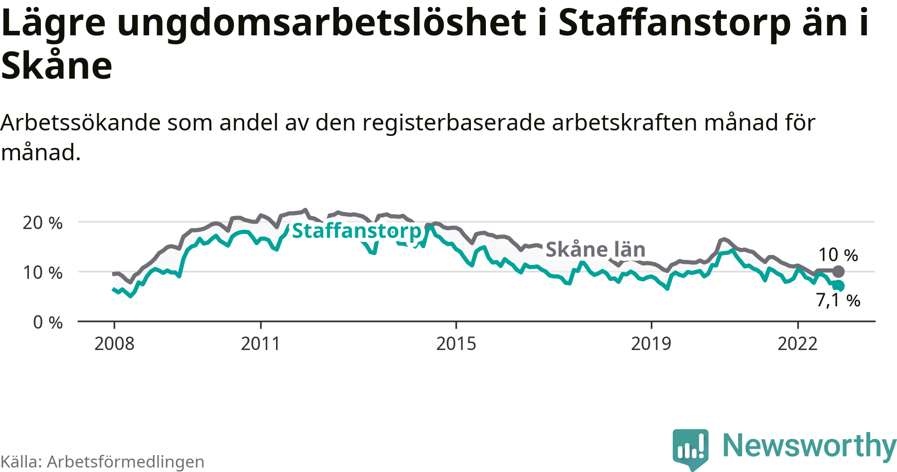Precis som den totala arbetslösheten ligger ungdomsarbetslösheten i Staffanstorp lägre än i Skåne som helhet. Skillnaden mellan kommunen och länet är 2,9 procentenheter.