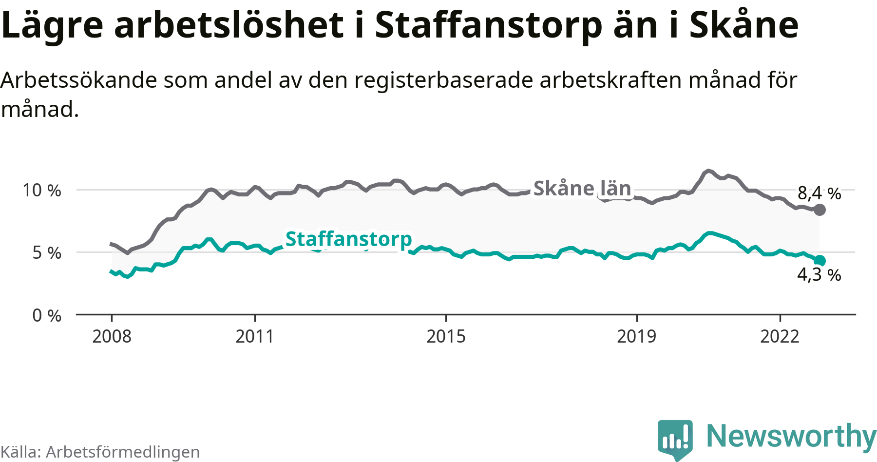 Det är 20:e månaden i följd som arbetslösheten i Staffanstorp är lägre än den var under samma tidpunkt året innan. Sedan mars 2021 har arbetslösheten gått ner från 5,5 till 4,3 procent. Den nuvarande arbetslöshetsnivån är därmed den lägsta sedan maj 2009.