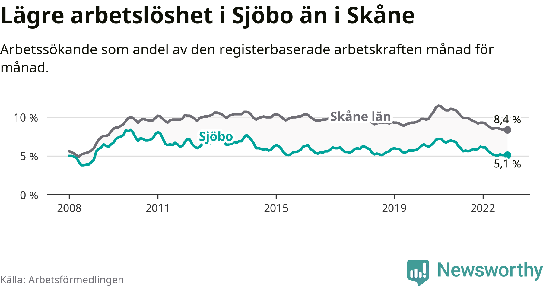 Det är 20:e månaden i följd som arbetslösheten i Sjöbo är lägre än den var under samma tidpunkt året innan. Sedan mars 2021 har arbetslösheten gått ner från 6,3 till 5,1 procent.