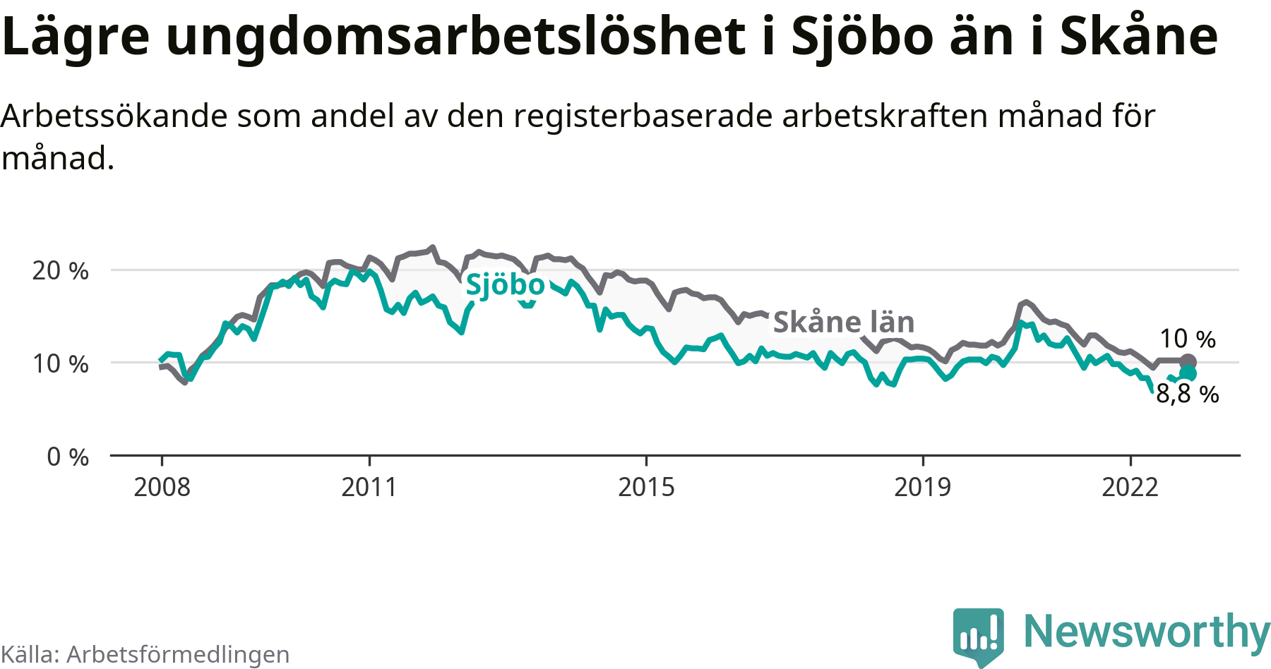 I och med den senaste månadens nedgång har de ungas arbetslöshet i Sjöbo sjunkit 20 månader i följd (ner från 11,6 procent i mars 2021 till 8,8 procent nu).