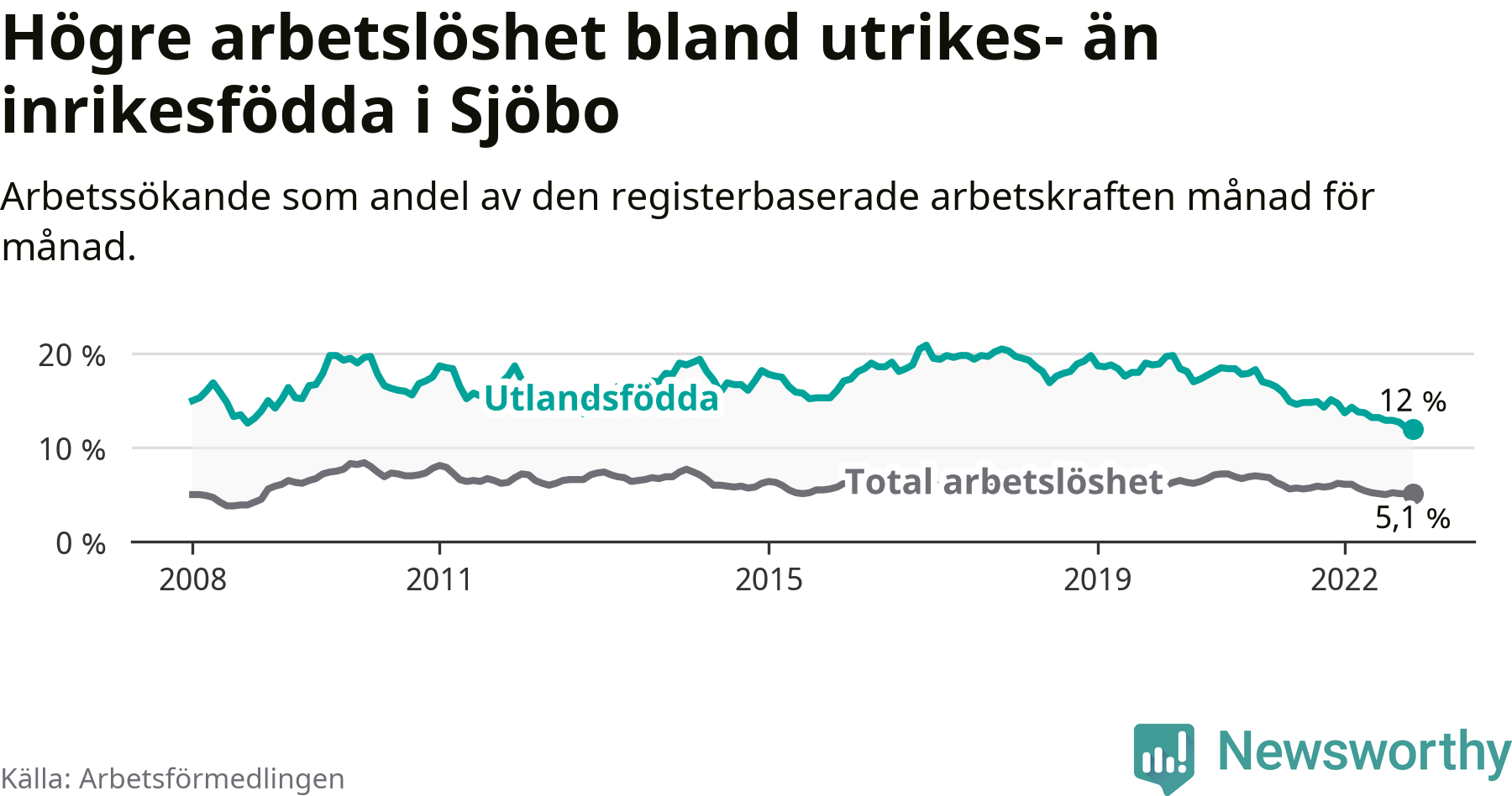 Skillnaden i arbetslöshet mellan utrikesfödda och hela befolkningen är 6,9 procentenheter i Sjöbo. Det är en betydligt mindre skillnad än för ett år sedan (−2,3 procentenheter).