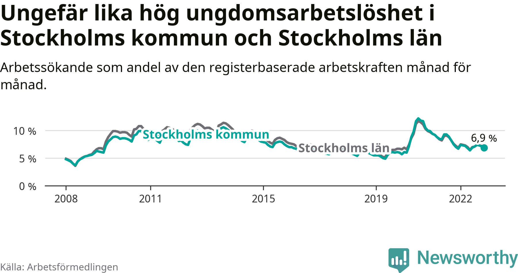 Precis som den totala arbetslösheten ligger ungdomsarbetslösheten i Stockholm på i stort sett samma nivå som i Stockholms län som helhet.