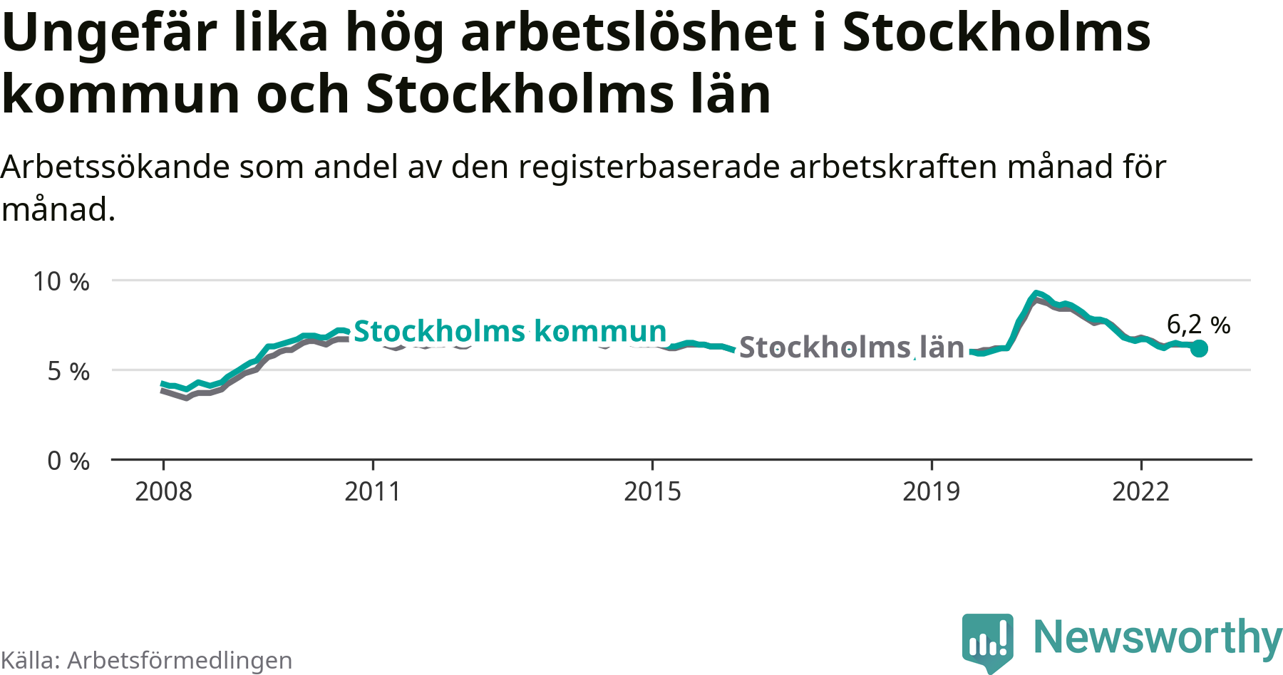 Det är 19:e månaden i följd som arbetslösheten i Stockholm är lägre än den var under samma tidpunkt året innan. Sedan april 2021 har arbetslösheten gått ner från 7,9 till 6,2 procent.