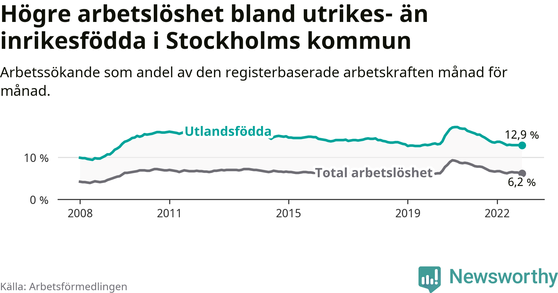 | Bland utlandsfödda | 12,9 % | −0,7 % ▼ | 12,9 % | −0,8 % ▼ | 16,5 % | −1,3 % ▼ |