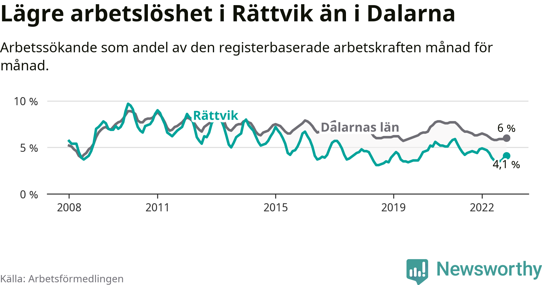 Det är 20:e månaden i följd som arbetslösheten i Rättvik är lägre än den var under samma tidpunkt året innan. Sedan mars 2021 har arbetslösheten gått ner från 5,4 till 4,1 procent.