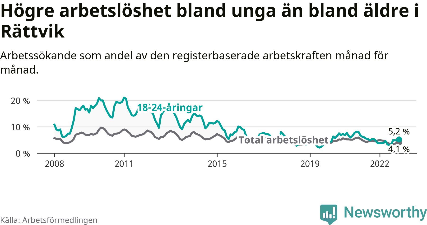 Till skillnad från den totala arbetslösheten stiger arbetslösheten bland unga (+0,5 procentenheter). I november var 5,2 procent av 18–24-åringarna inskrivna som arbetssökande (motsvarande 24 personer). Mäter vi antalet inskrivna ser vi en ökning med ett personer på ett års sikt.