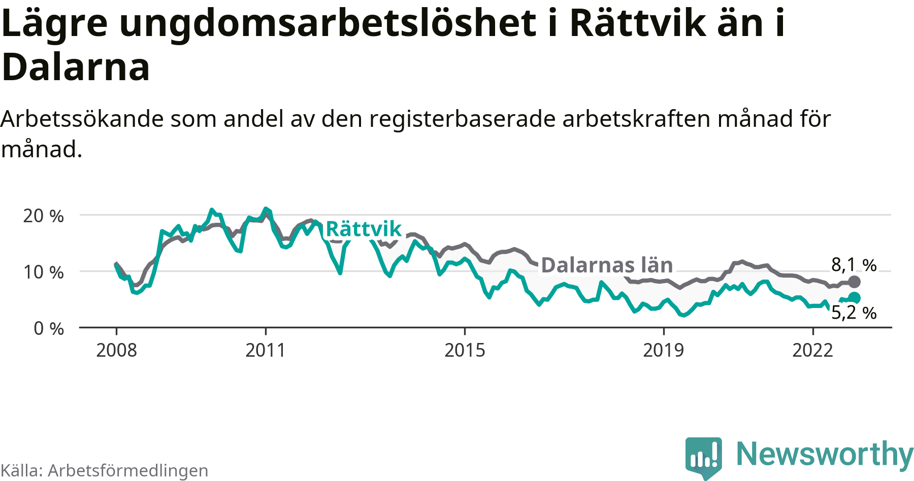Precis som den totala arbetslösheten ligger ungdomsarbetslösheten i Rättvik lägre än i Dalarna som helhet. Skillnaden mellan kommunen och länet är 2,9 procentenheter.