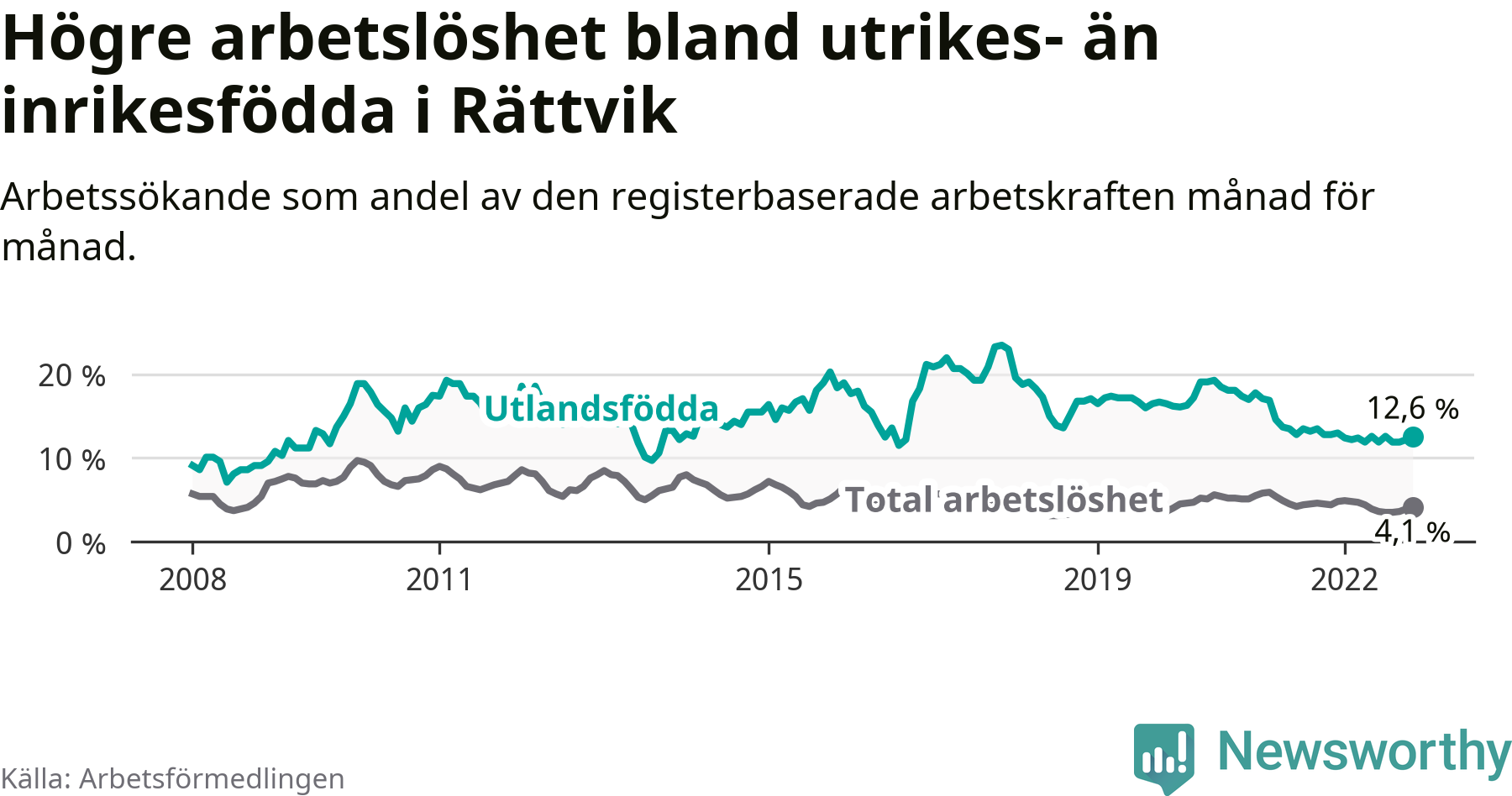 | Bland utlandsfödda | 12,6 % | −0,2 % ▼ | 20,9 % | −0,9 % ▼ | 16,5 % | −1,3 % ▼ |