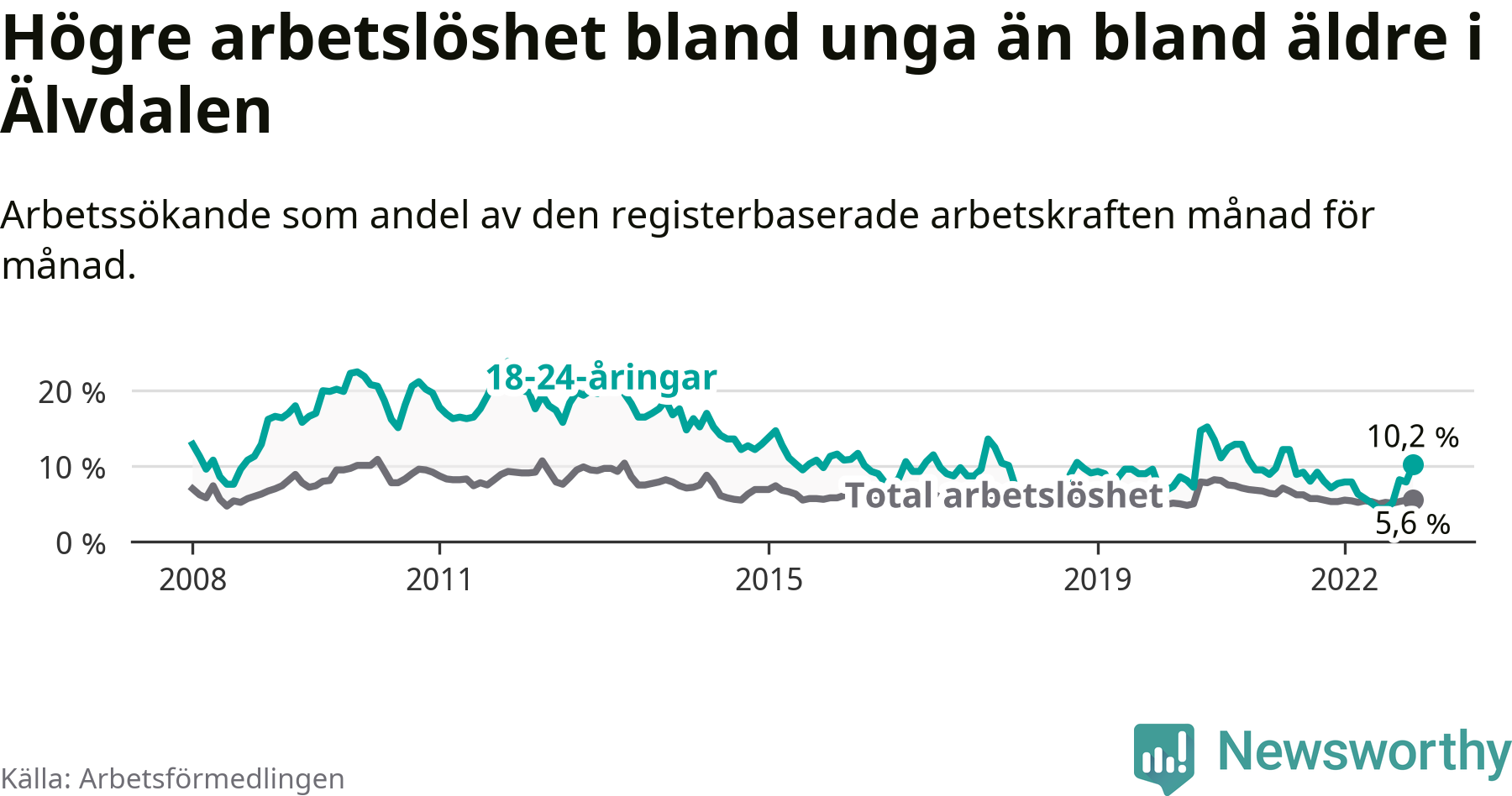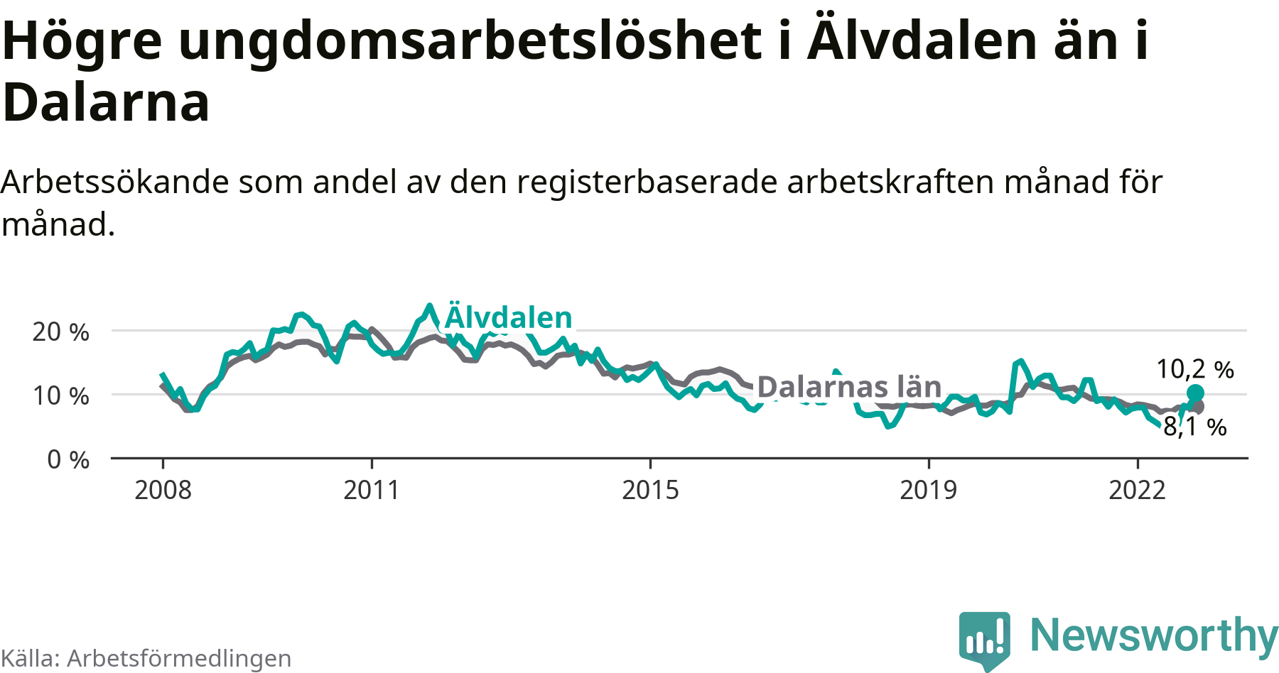Medan Älvdalen har lägre total arbetslöshet än Dalarna, ligger ungdomsarbetslösheten 2,1 procentenheter högre i Älvdalen.