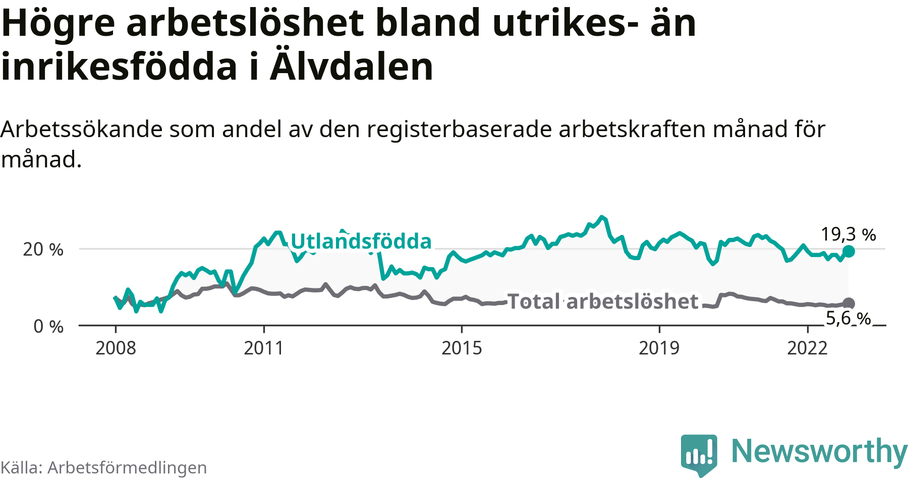 Skillnaden i arbetslöshet mellan utrikesfödda och hela befolkningen är 13,7 procentenheter i Älvdalen.