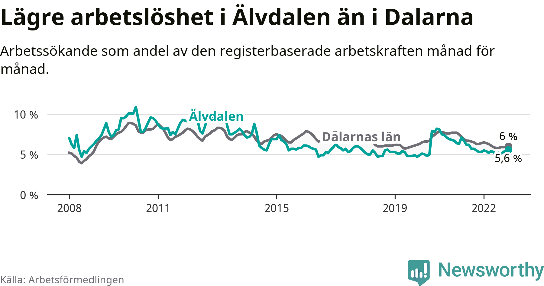 Även om arbetslösheten i Älvdalen alltså ökar, så ligger den fortfarande under snittet i hela Dalarnas län (5,6 procent i kommunen, jämfört med 6,0 procent i hela länet). Gagnef har den lägsta arbetslösheten i länet (3,3 procent), medan Avesta har den högsta (8,6 procent). För att Älvdalen skulle komma ner i samma arbetslöshetsnivå som Gagnef skulle 74 personer behöva sysselsättas.