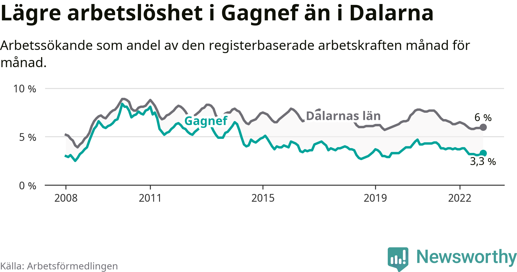 Gagnef hade redan tidigare lägre arbetslöshet än snittet i hela Dalarnas län och nu växer klyftan (3,3 procent i kommunen, jämfört med 6,0 procent i hela länet). Gagnef har därmed även den lägsta arbetslöshetsnivån i länet. Avesta har den högsta (8,6 procent).