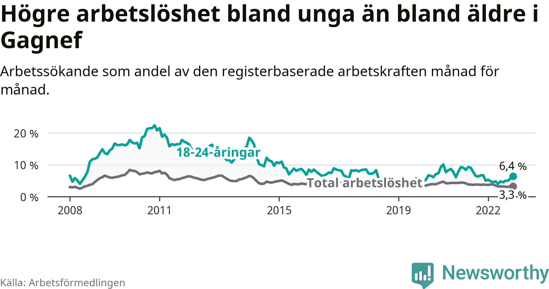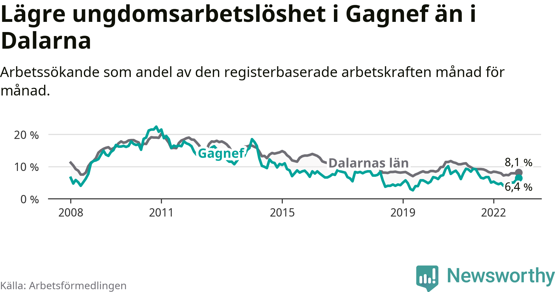 Precis som den totala arbetslösheten ligger ungdomsarbetslösheten i Gagnef lägre än i Dalarna som helhet. Skillnaden mellan kommunen och länet är 1,7 procentenheter.