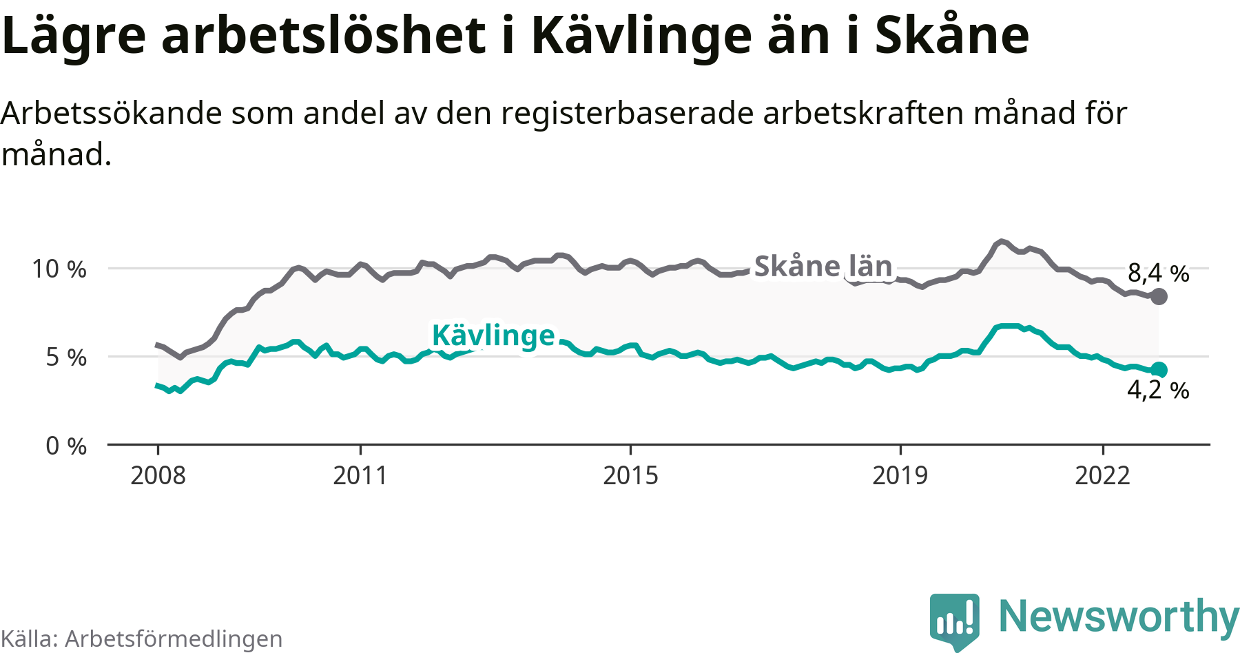 Det är 19:e månaden i följd som arbetslösheten i Kävlinge är lägre än den var under samma tidpunkt året innan. Sedan april 2021 har arbetslösheten gått ner från 5,7 till 4,2 procent.