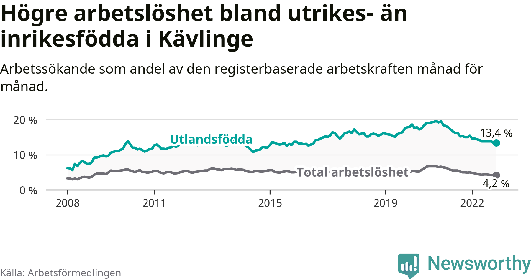 Skillnaden i arbetslöshet mellan utrikesfödda och hela befolkningen är 9,2 procentenheter i Kävlinge. Det är en mindre skillnad än för ett år sedan (−0,9 procentenheter).