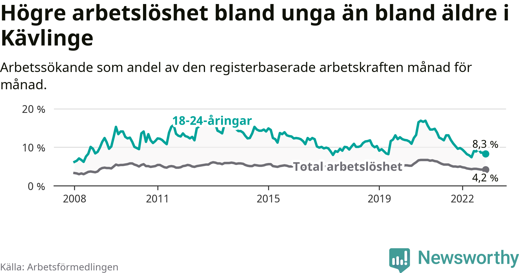 Precis som den totala arbetslösheten ligger ungdomsarbetslösheten i Kävlinge lägre än i Skåne som helhet. Skillnaden mellan kommunen och länet är 1,7 procentenheter.