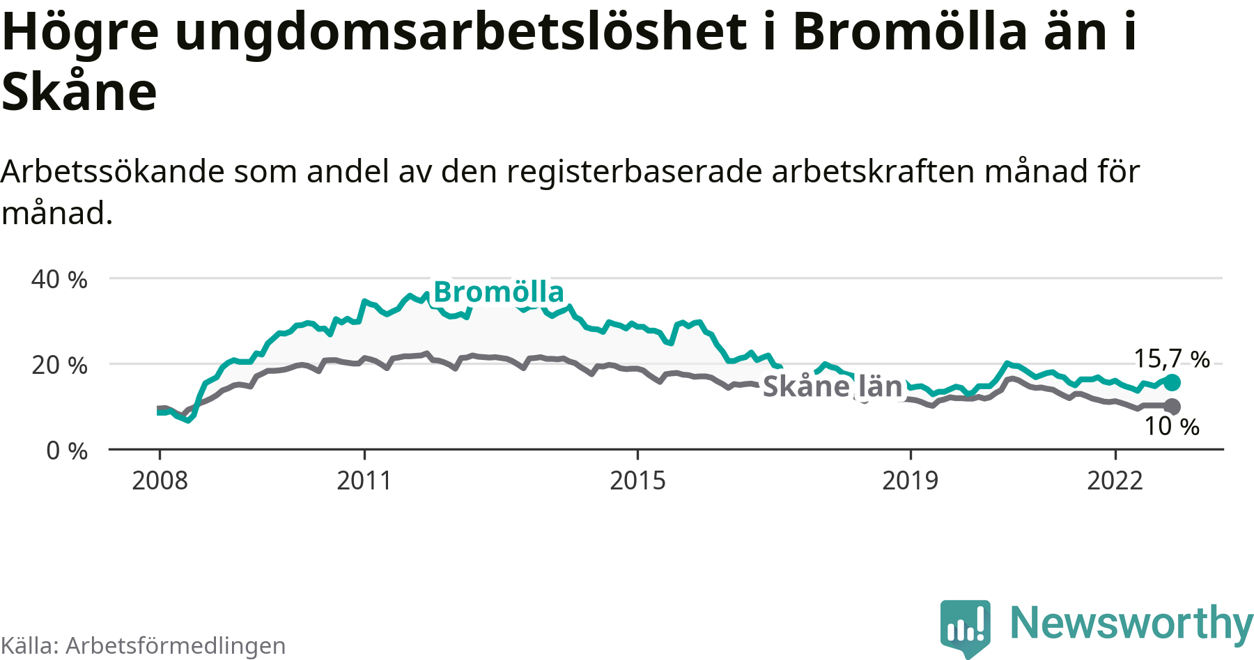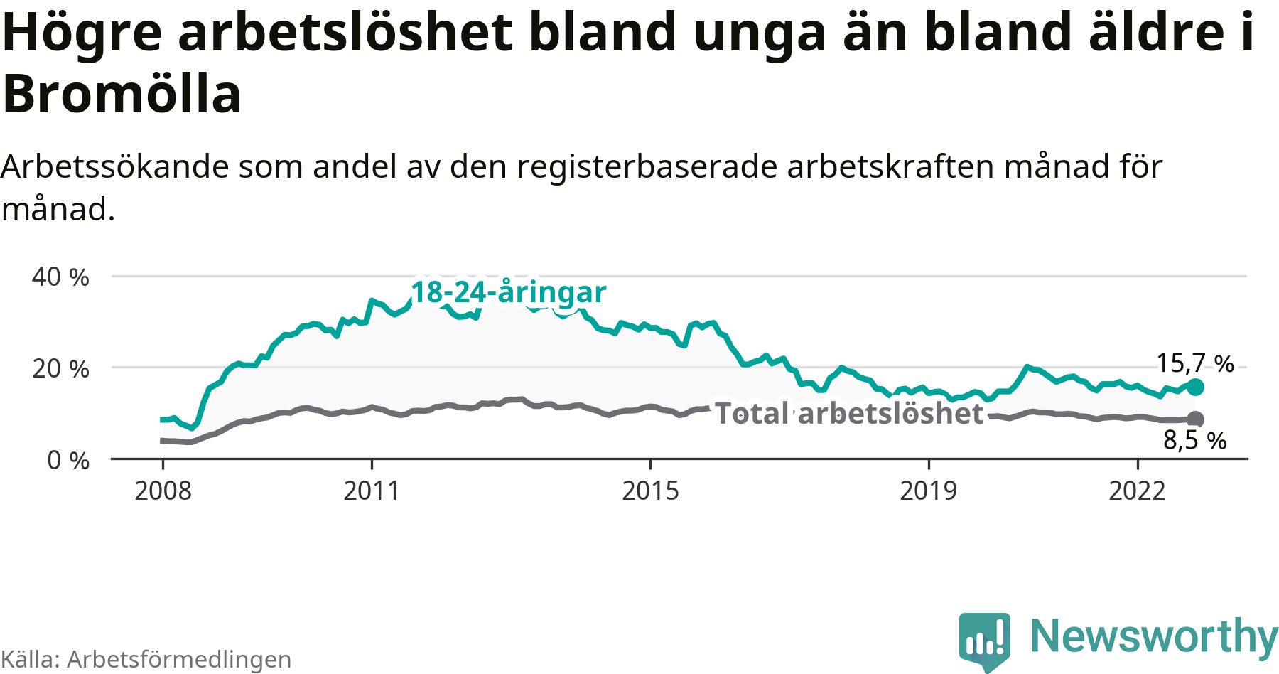 Medan Bromölla har ungefär samma total arbetslöshet som Skåne, ligger ungdomsarbetslösheten 5,7 procentenheter högre i Bromölla.