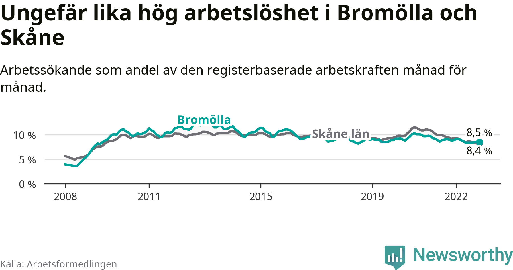 Under november månad rapporterade Bromölla kommun en total arbetslöshet på 8,5 procent. Det är en minskning jämfört med samma tidpunkt i fjol (−0,3 procentenheter). Även i Skåne län sjunker arbetslösheten .