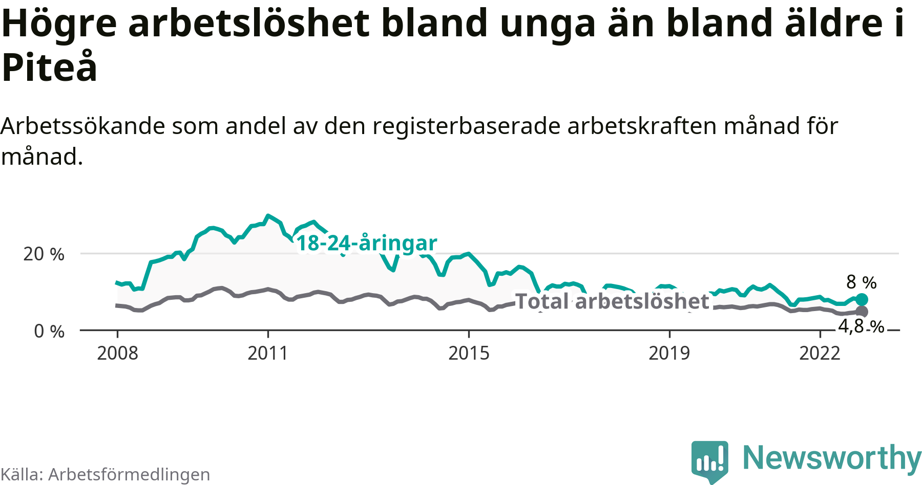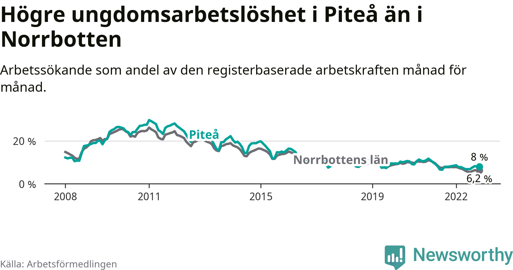 Precis som den totala arbetslösheten ligger ungdomsarbetslösheten i Piteå högre än i Norrbotten som helhet. Skillnaden mellan kommunen och länet är 1,8 procentenheter.