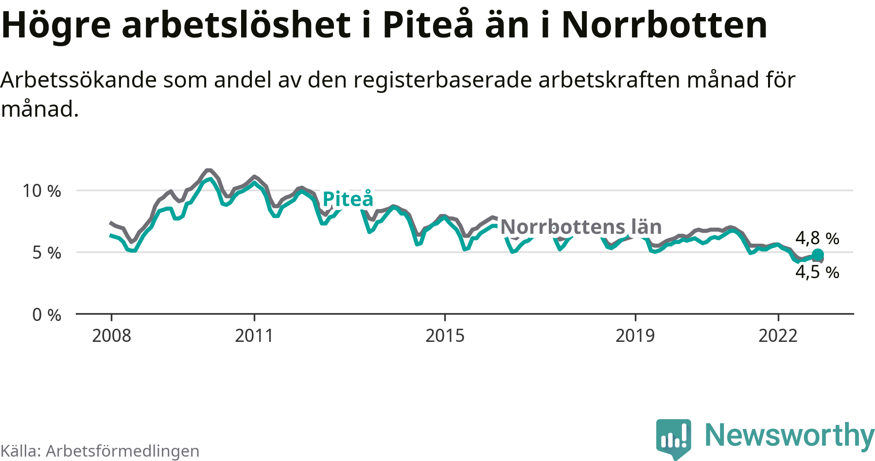 Det är 19:e månaden i följd som arbetslösheten i Piteå är lägre än den var under samma tidpunkt året innan. Sedan april 2021 har arbetslösheten gått ner från 6,1 till 4,8 procent.