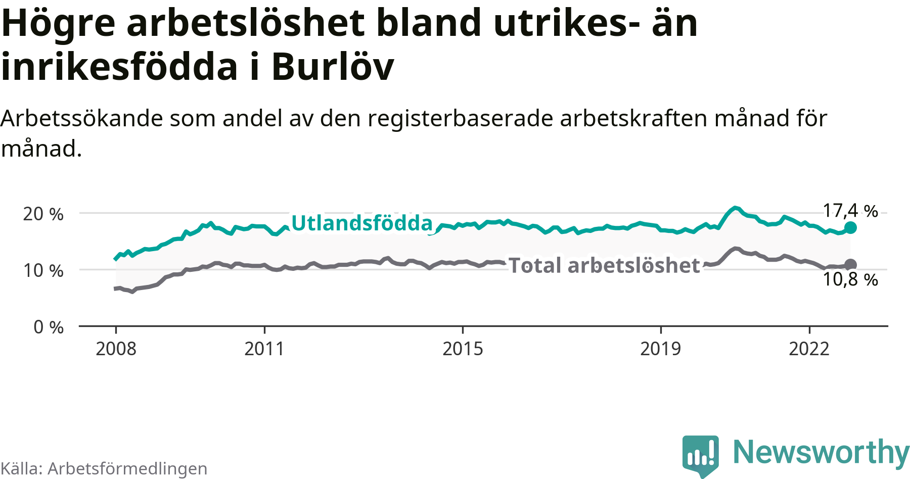 Skillnaden i arbetslöshet mellan utrikesfödda och hela befolkningen är 6,6 procentenheter i Burlöv. Det är ungefär samma skillnad som för ett år sedan.