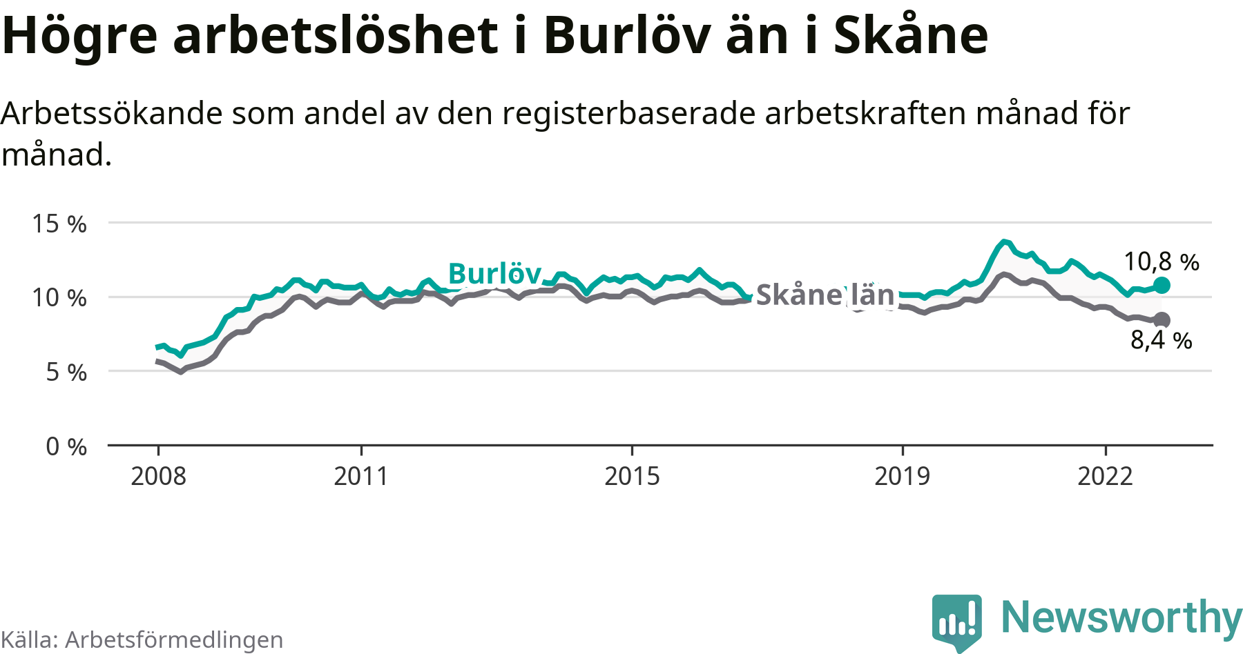 Flen och Perstorp är de kommuner som har högst arbetslöshet just nu (12,6 procent) i landet som helhet, medan Öckerö har den lägsta (2,5 procent). Burlövs arbetslöshet sticker ut som den sjunde högsta i hela landet.