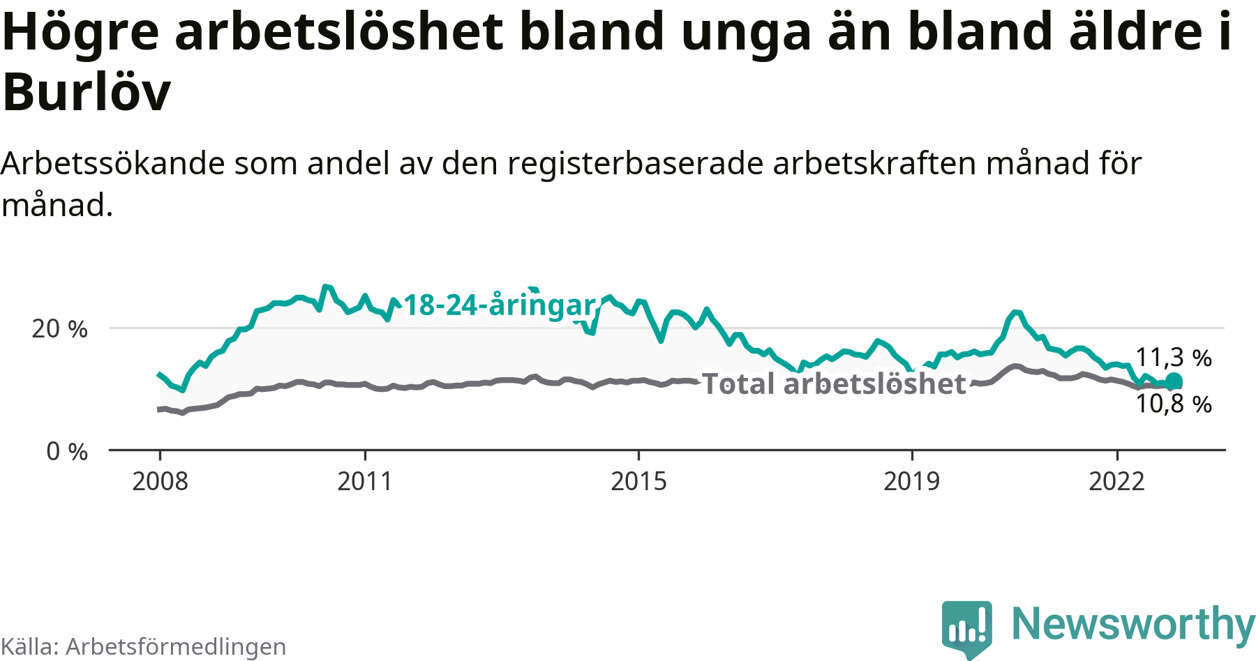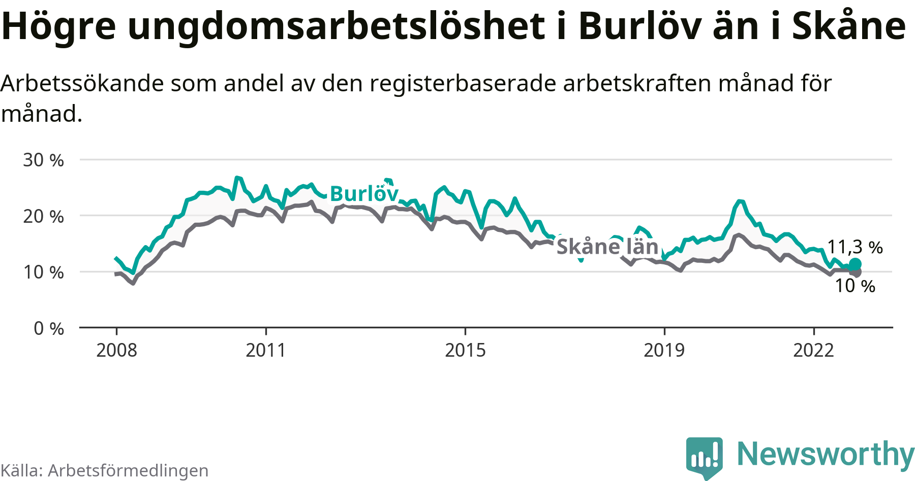 Precis som den totala arbetslösheten ligger ungdomsarbetslösheten i Burlöv högre än i Skåne som helhet. Skillnaden mellan kommunen och länet är 1,3 procentenheter.
