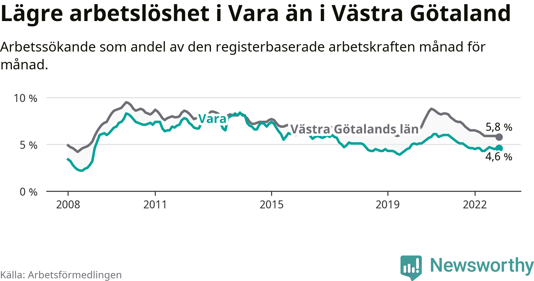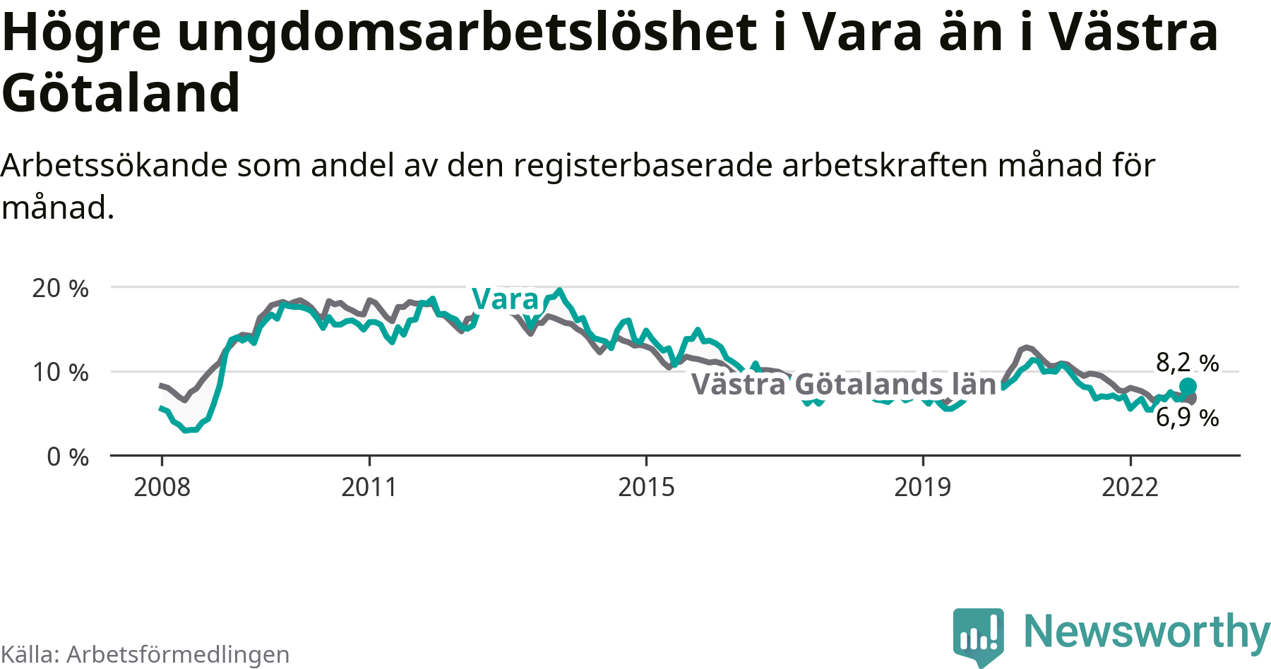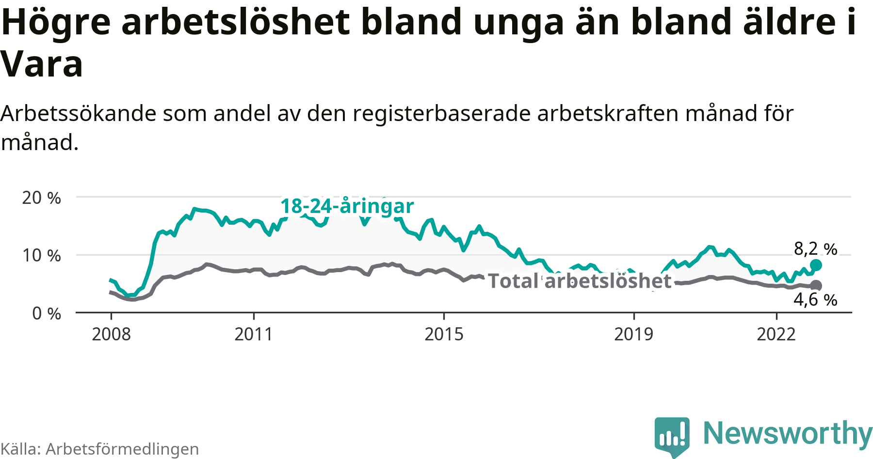 Medan Vara har lägre total arbetslöshet än Västra Götaland, ligger ungdomsarbetslösheten 1,3 procentenheter högre i Vara.