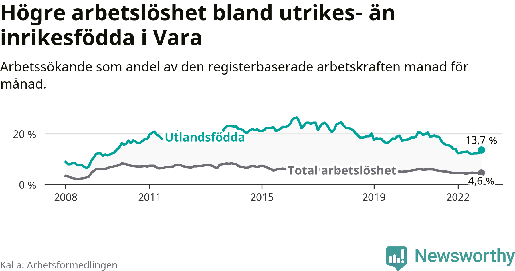 Arbetslösheten bland utlandsfödda var 13,7 procent i Vara under november månad, motsvarande 133 av 971 personer. Det är 0,4 procentenheter färre än vid samma tidpunkt i fjol (+10 om man räknar personer). Därmed är de utlandsföddas arbetslöshet lägre än vid samma tidpunkt i fjol för 18:e månaden i följd. Sedan maj 2021 har arbetslösheten bland utlandsfödda minskat från 18,8 till 13,7 procent.