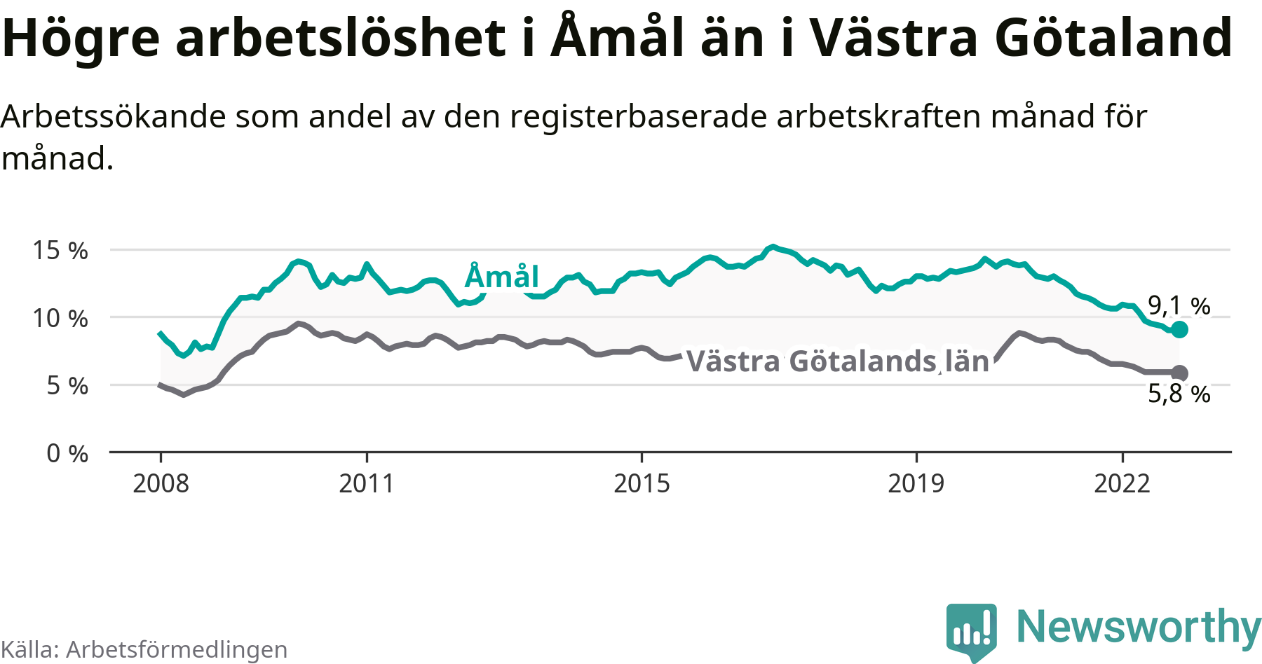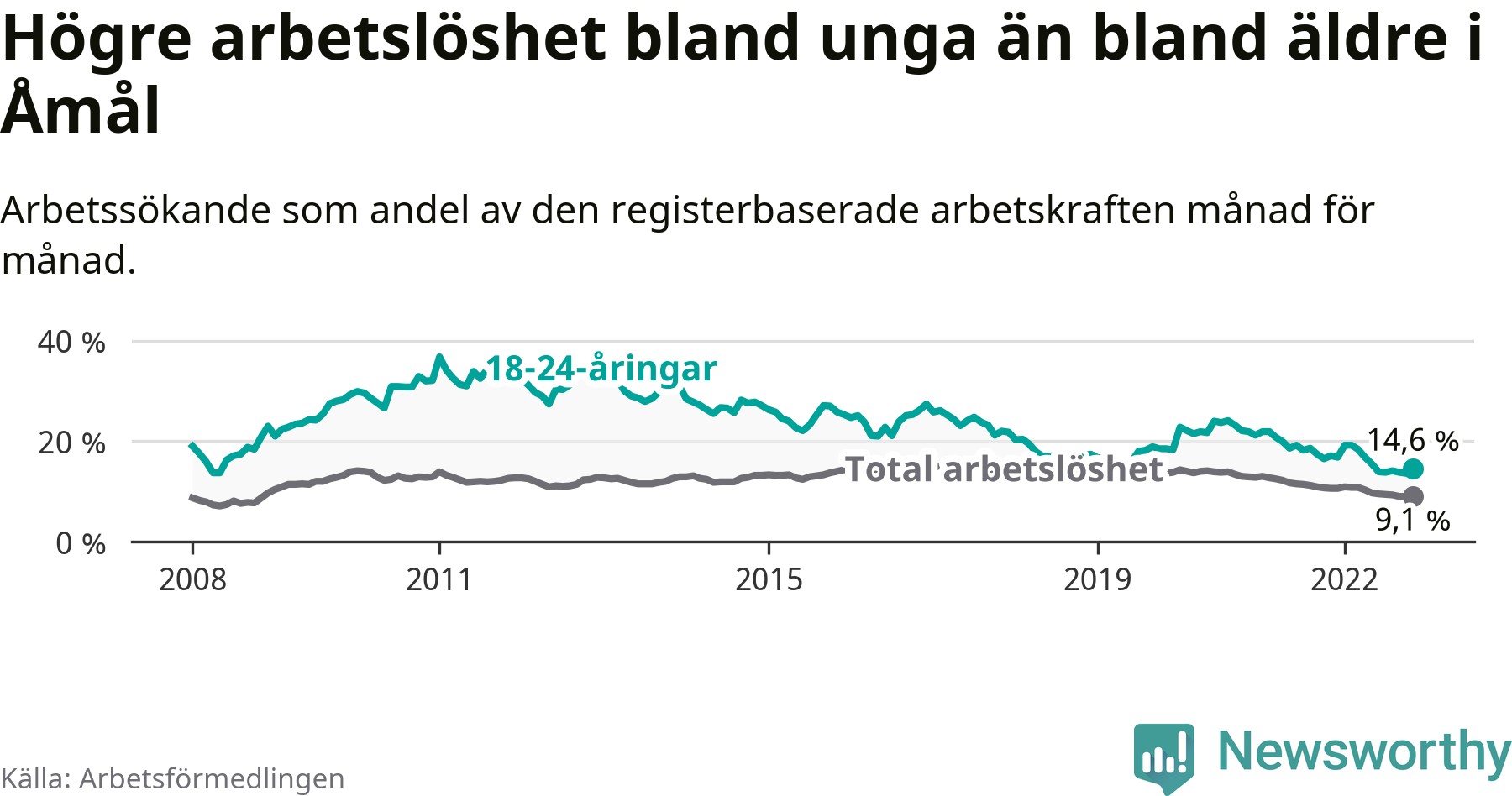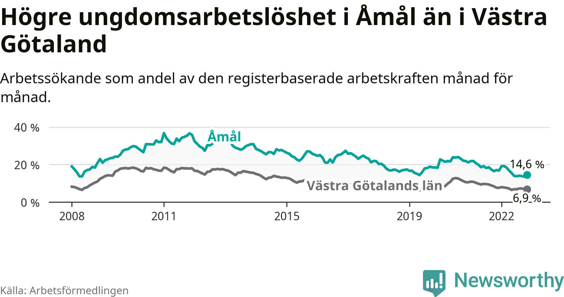 Precis som den totala arbetslösheten ligger ungdomsarbetslösheten i Åmål högre än i Västra Götaland som helhet. Skillnaden mellan kommunen och länet är 7,7 procentenheter.