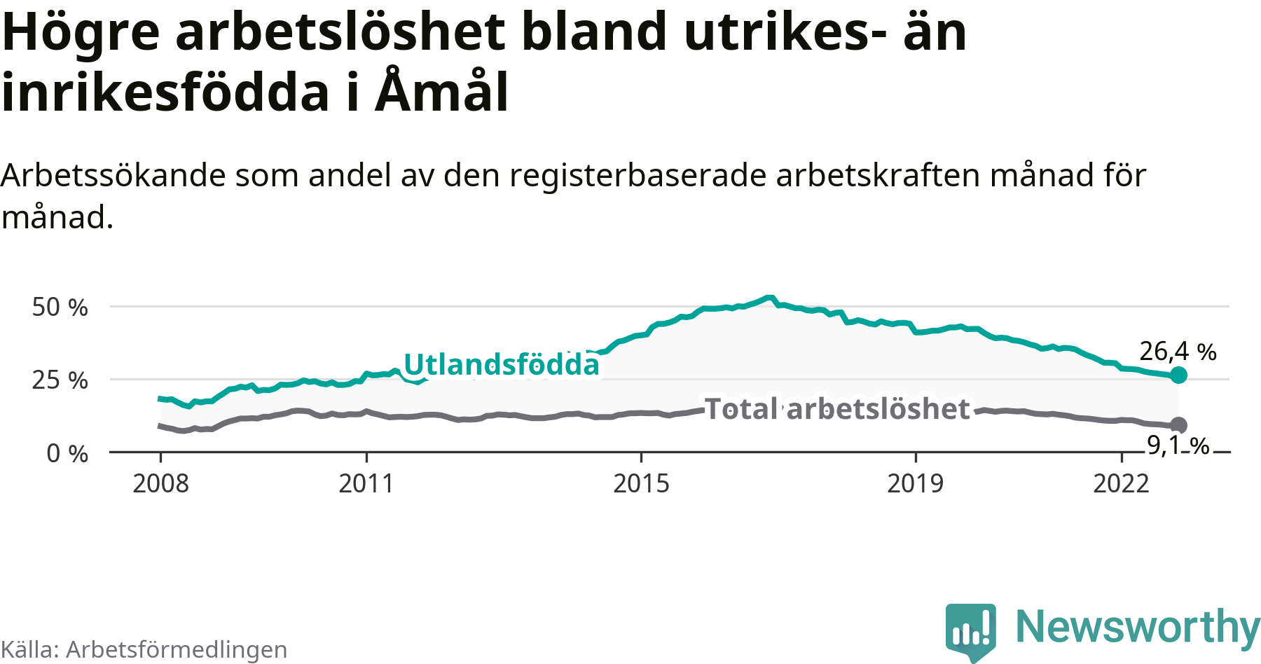 Arbetslösheten bland utlandsfödda var 26,4 procent i Åmål under november månad, motsvarande 259 av 981 personer. Det är 4,1 procentenheter färre än vid samma tidpunkt i fjol (−38 om man räknar personer). Därmed har de utlandsföddas arbetslöshet varit lägre än vid samma tidpunkt i fjol i över fem år i sträck. Sedan maj 2017 har arbetslösheten bland utlandsfödda minskat från 49,2 till 26,4 procent.