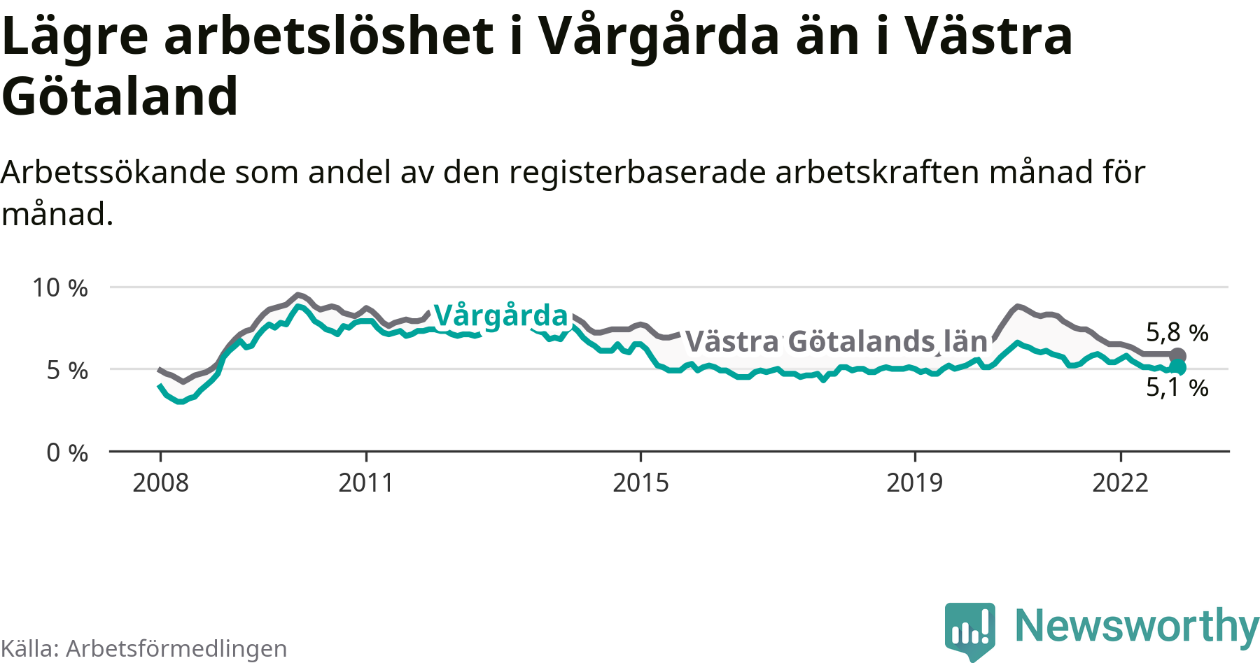 Vårgårda hade redan tidigare lägre arbetslöshet än snittet i hela Västra Götalands län och nu växer klyftan (5,1 procent i kommunen, jämfört med 5,8 procent i hela länet). Öckerö har den lägsta arbetslösheten i länet (2,5 procent), medan Trollhättan och Åmål har den högsta (9,1 procent). För att Vårgårda skulle komma ner i samma arbetslöshetsnivå som Öckerö skulle 153 personer behöva sysselsättas.