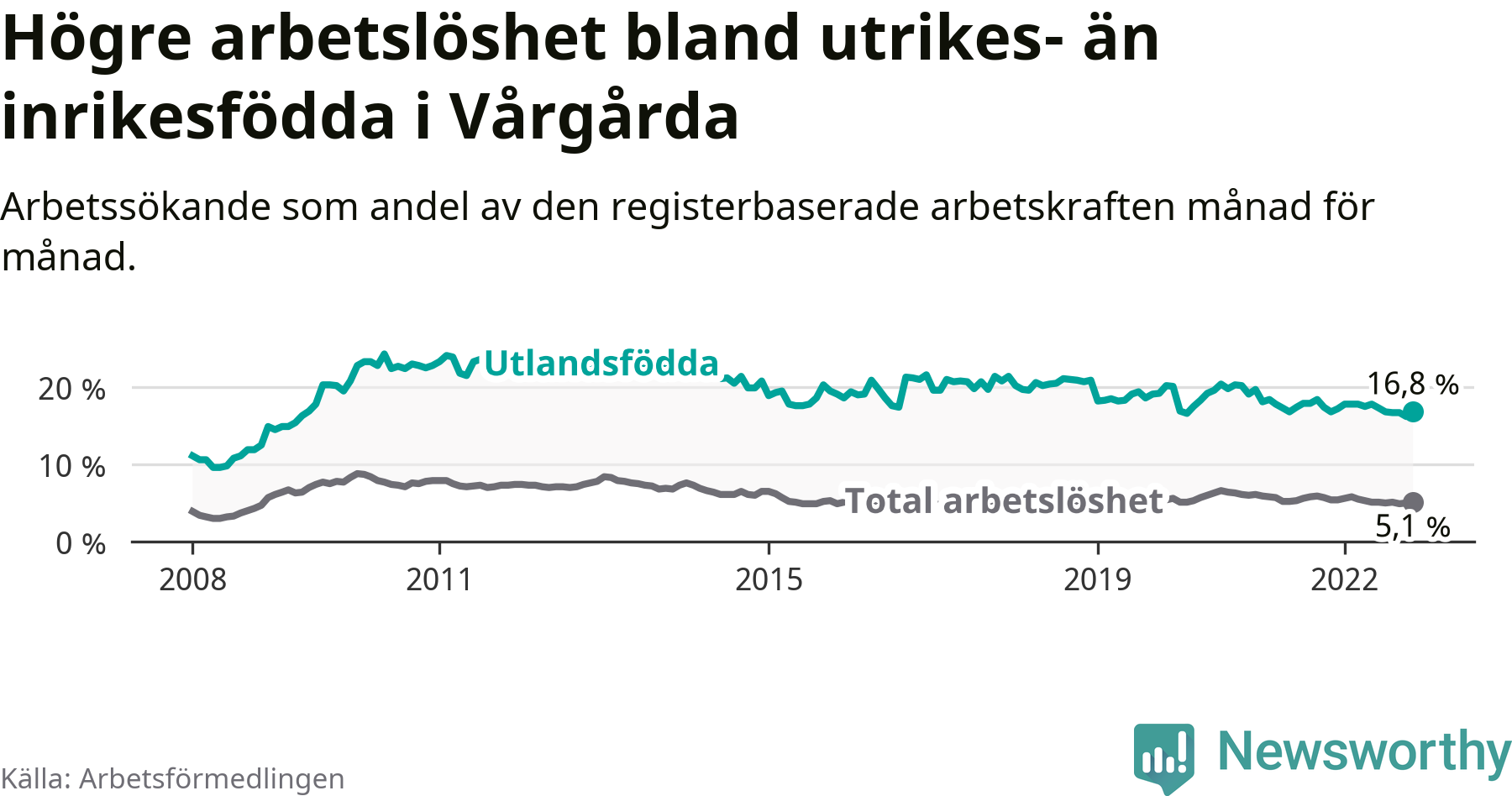 Arbetslösheten bland utlandsfödda var 16,8 procent i Vårgårda under november månad, motsvarande 165 av 982 personer. Det är i stort sett lika stor andel som i fjol.