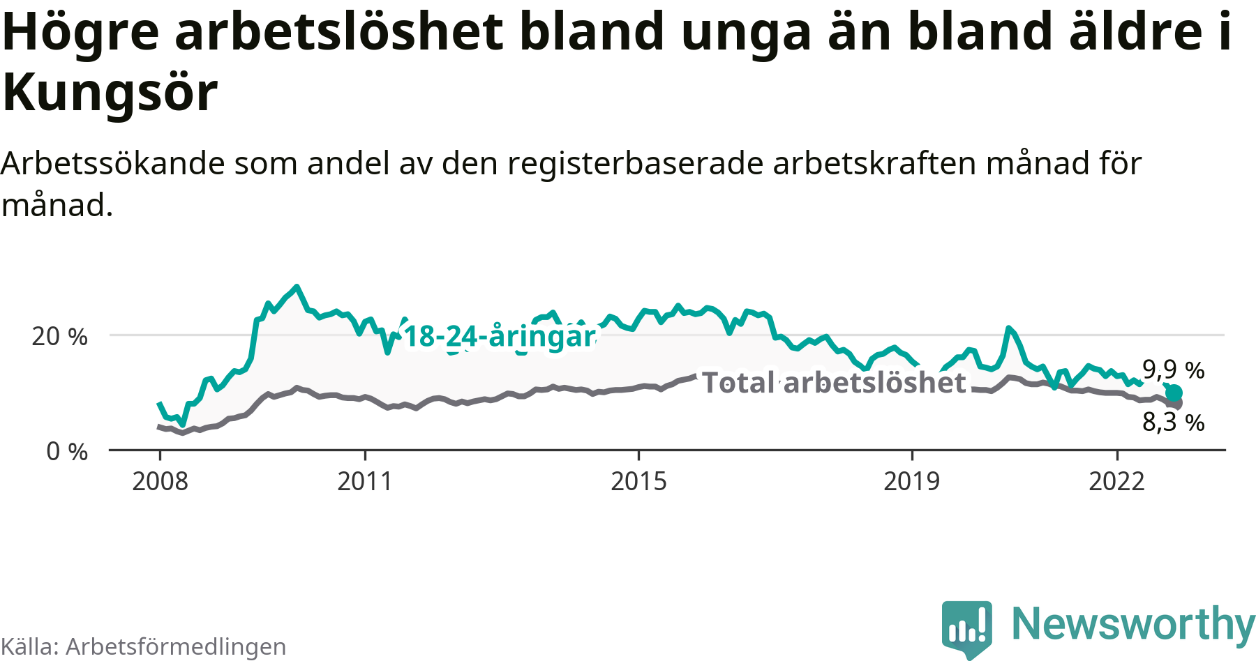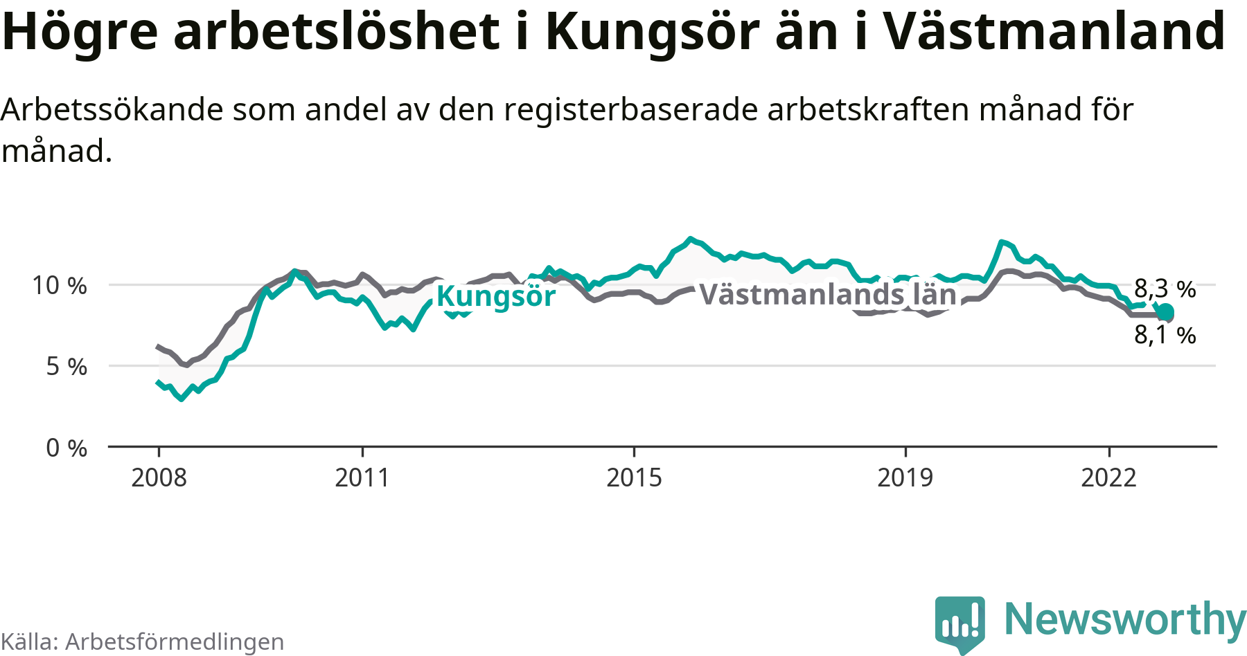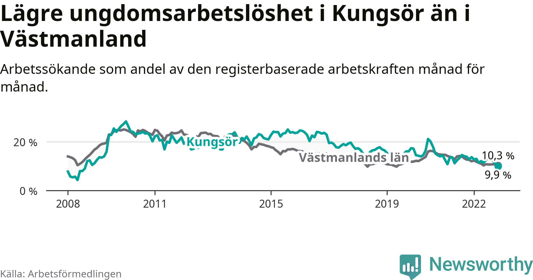 Medan Kungsör har högre total arbetslöshet än Västmanland, ligger ungdomsarbetslösheten 0,4 procentenheter lägre i Kungsör.