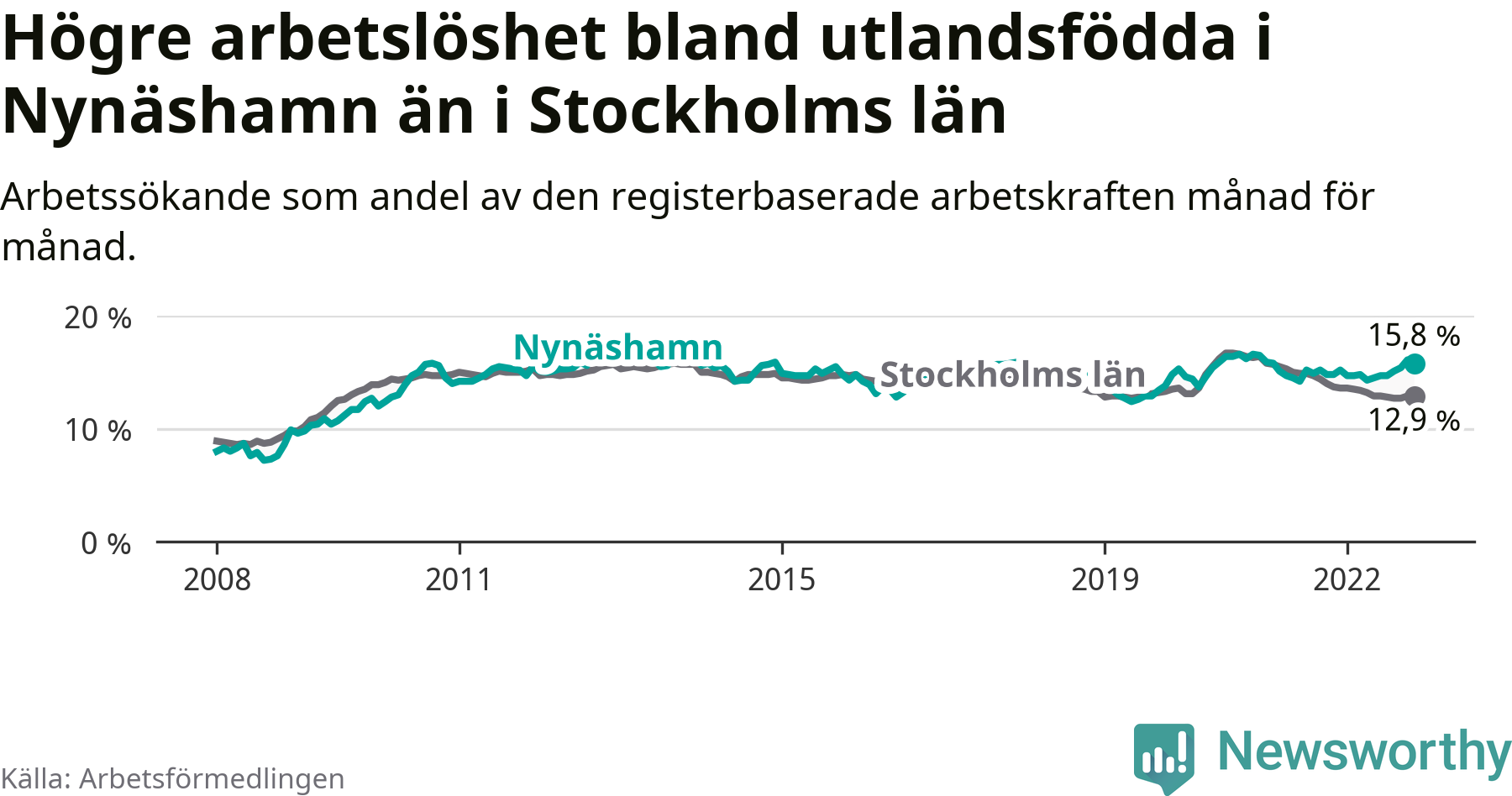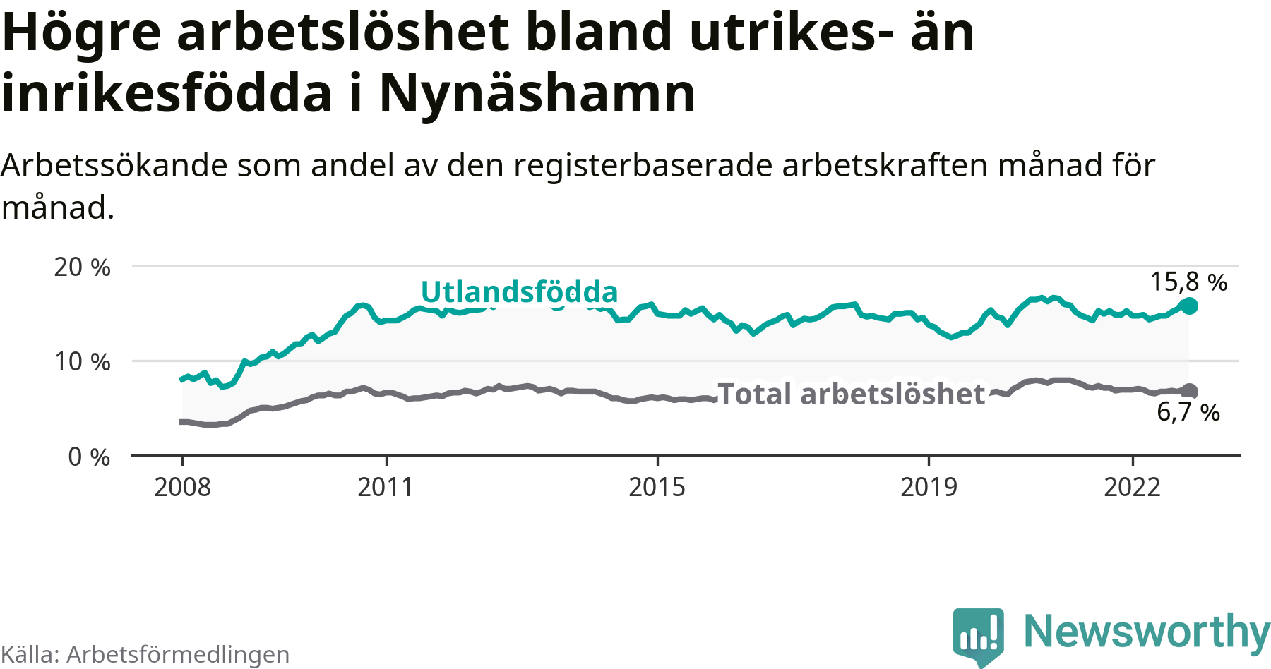Arbetslösheten bland utlandsfödda var 15,8 procent i Nynäshamn under november månad, motsvarande 521 av 3 297 personer. Det är 1,0 procentenheter fler än vid samma tidpunkt i fjol (+51 om man räknar personer).
