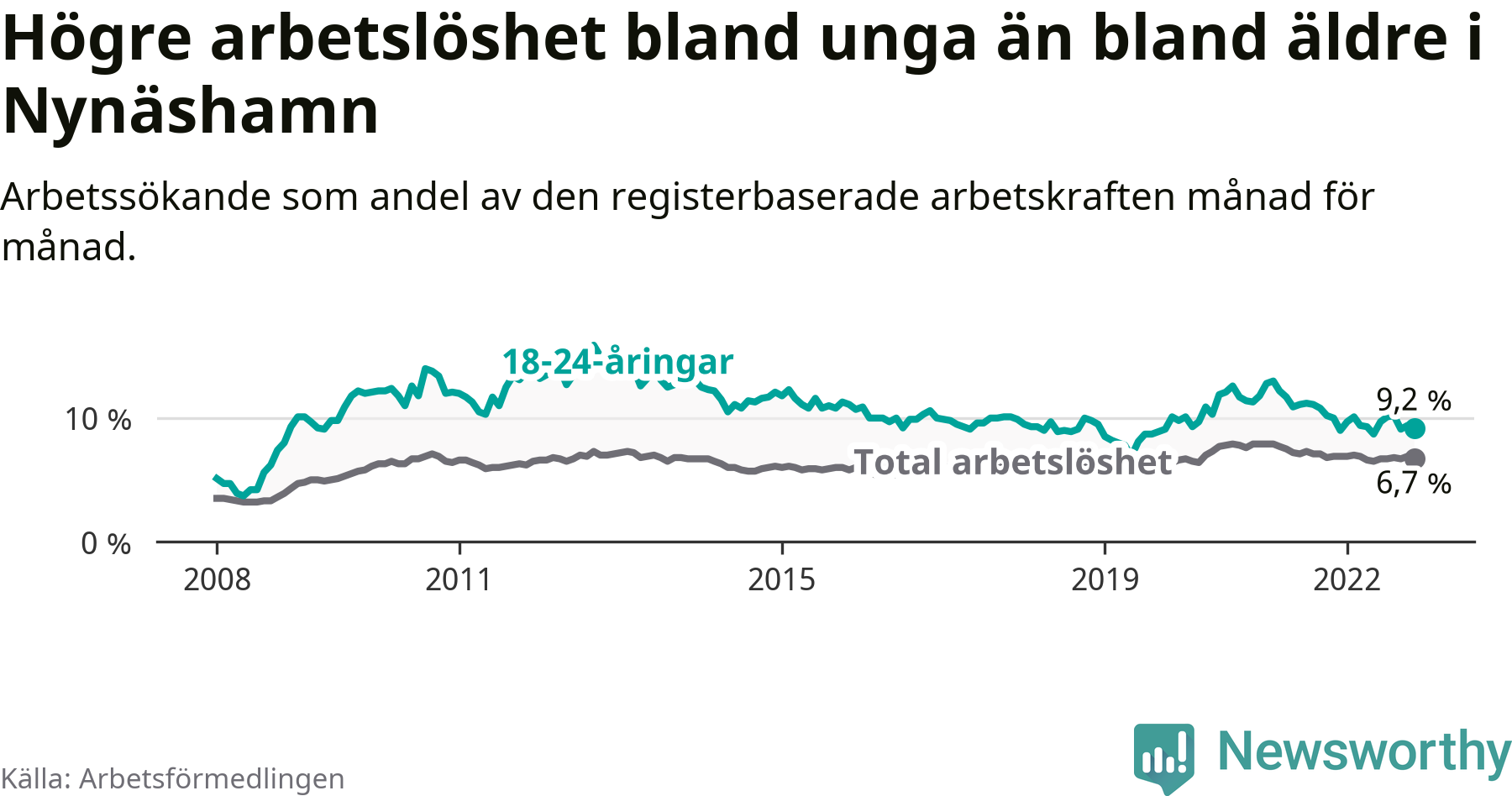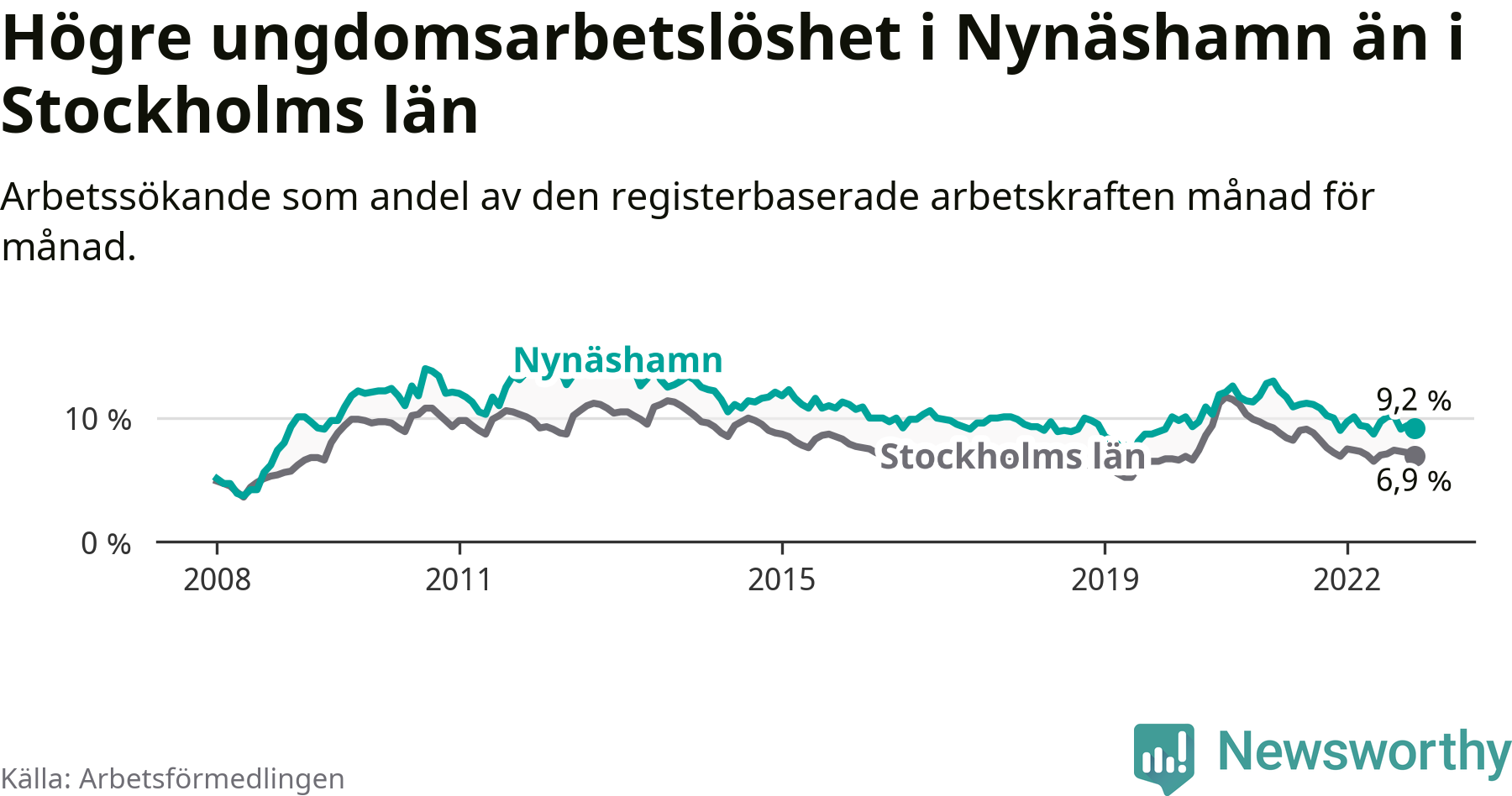 Precis som den totala arbetslösheten ligger ungdomsarbetslösheten i Nynäshamn högre än i Stockholms län som helhet. Skillnaden mellan kommunen och länet är 2,3 procentenheter.
