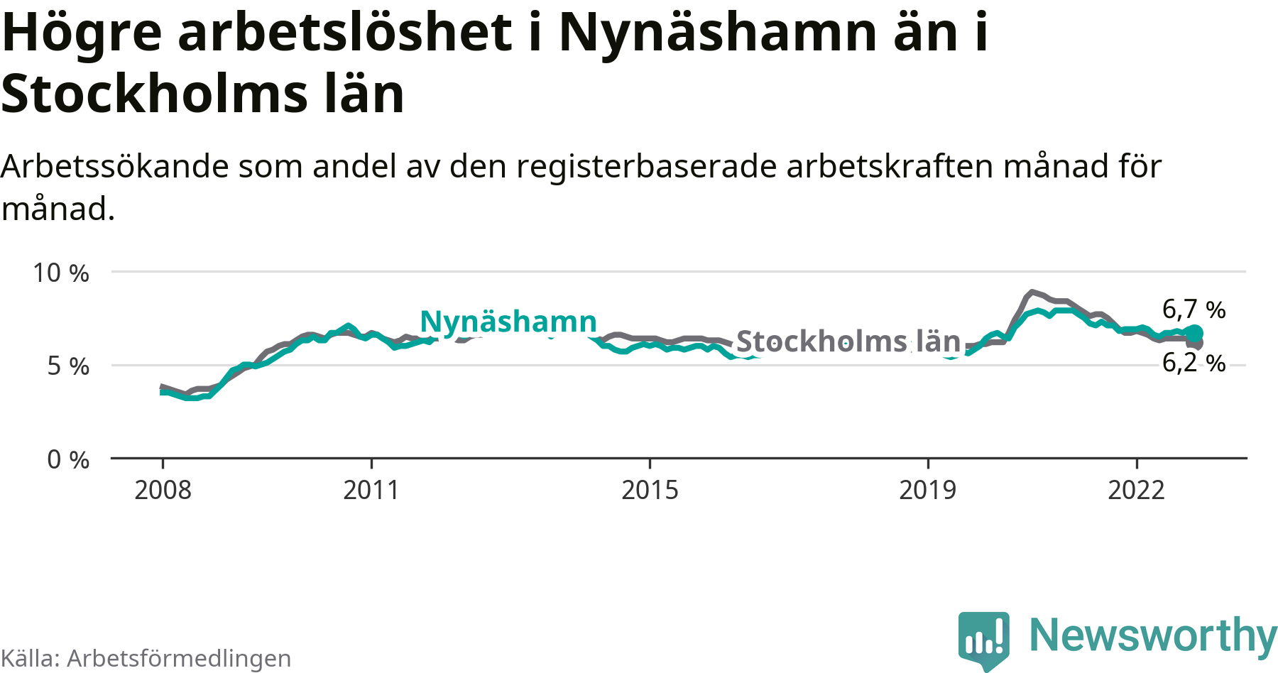 Även om arbetslösheten i Nynäshamn alltså minskar, så ligger den fortfarande över snittet i hela Stockholms län (6,7 procent i kommunen, jämfört med 6,2 procent i hela länet). Ekerö har den lägsta arbetslösheten i länet (3,1 procent), medan Botkyrka har den högsta (11,1 procent). För att Nynäshamn skulle komma ner i samma arbetslöshetsnivå som Ekerö skulle 498 personer behöva sysselsättas.