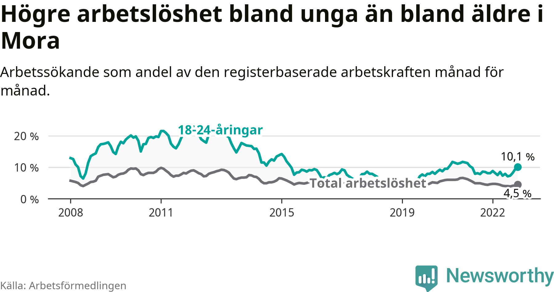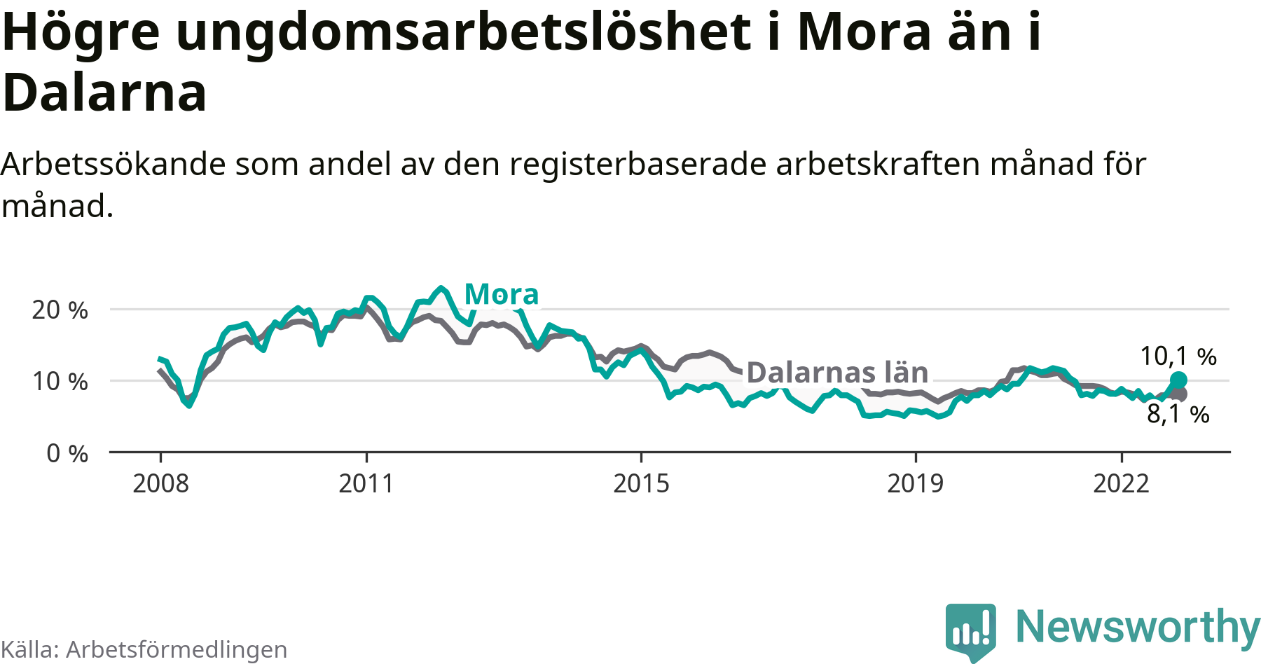 Medan Mora har lägre total arbetslöshet än Dalarna, ligger ungdomsarbetslösheten 2,0 procentenheter högre i Mora.