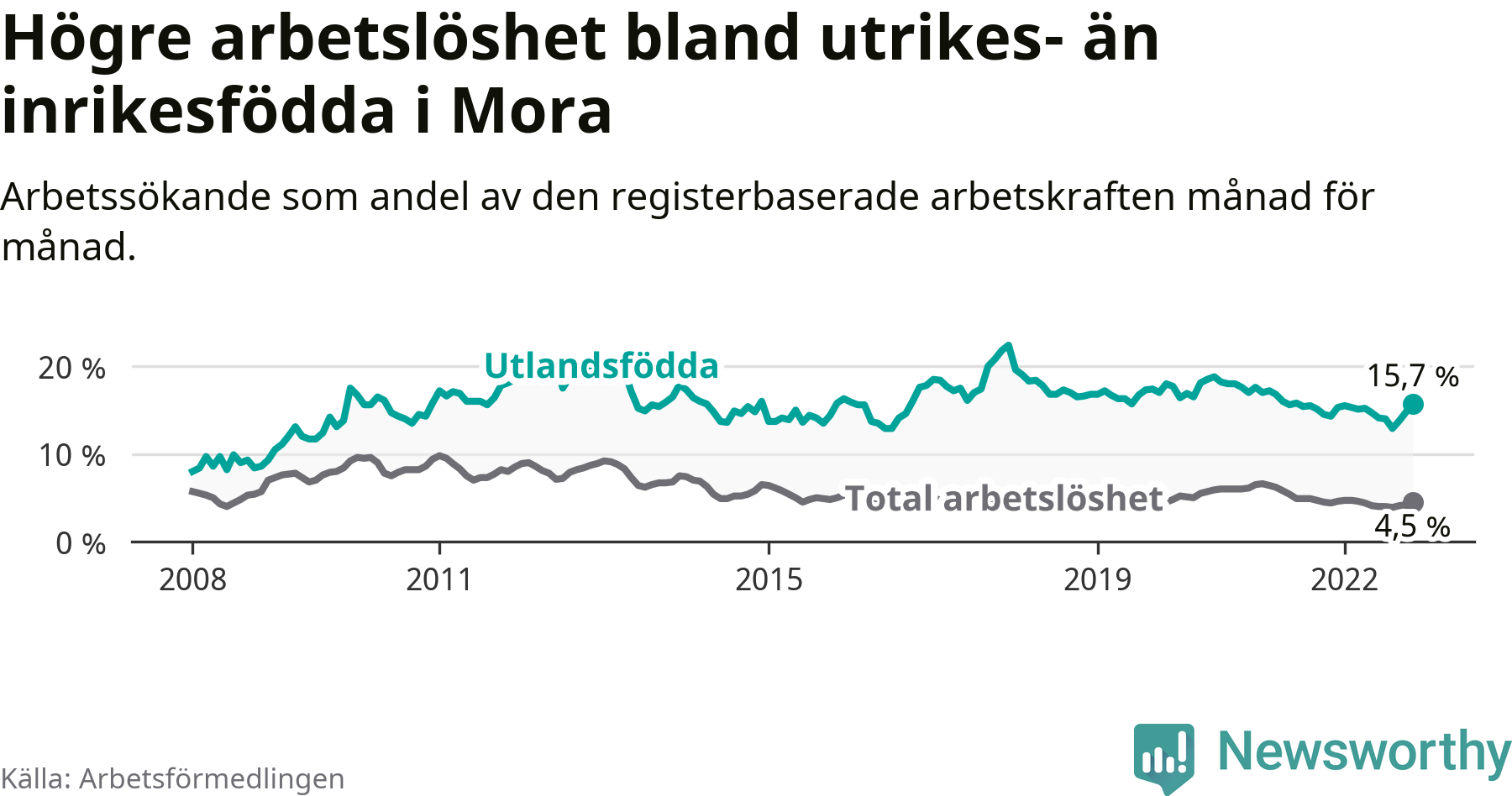 Skillnaden i arbetslöshet mellan utrikesfödda och hela befolkningen är 11,2 procentenheter i Mora. Det är en större skillnad än för ett år sedan (+1,3 procentenheter).