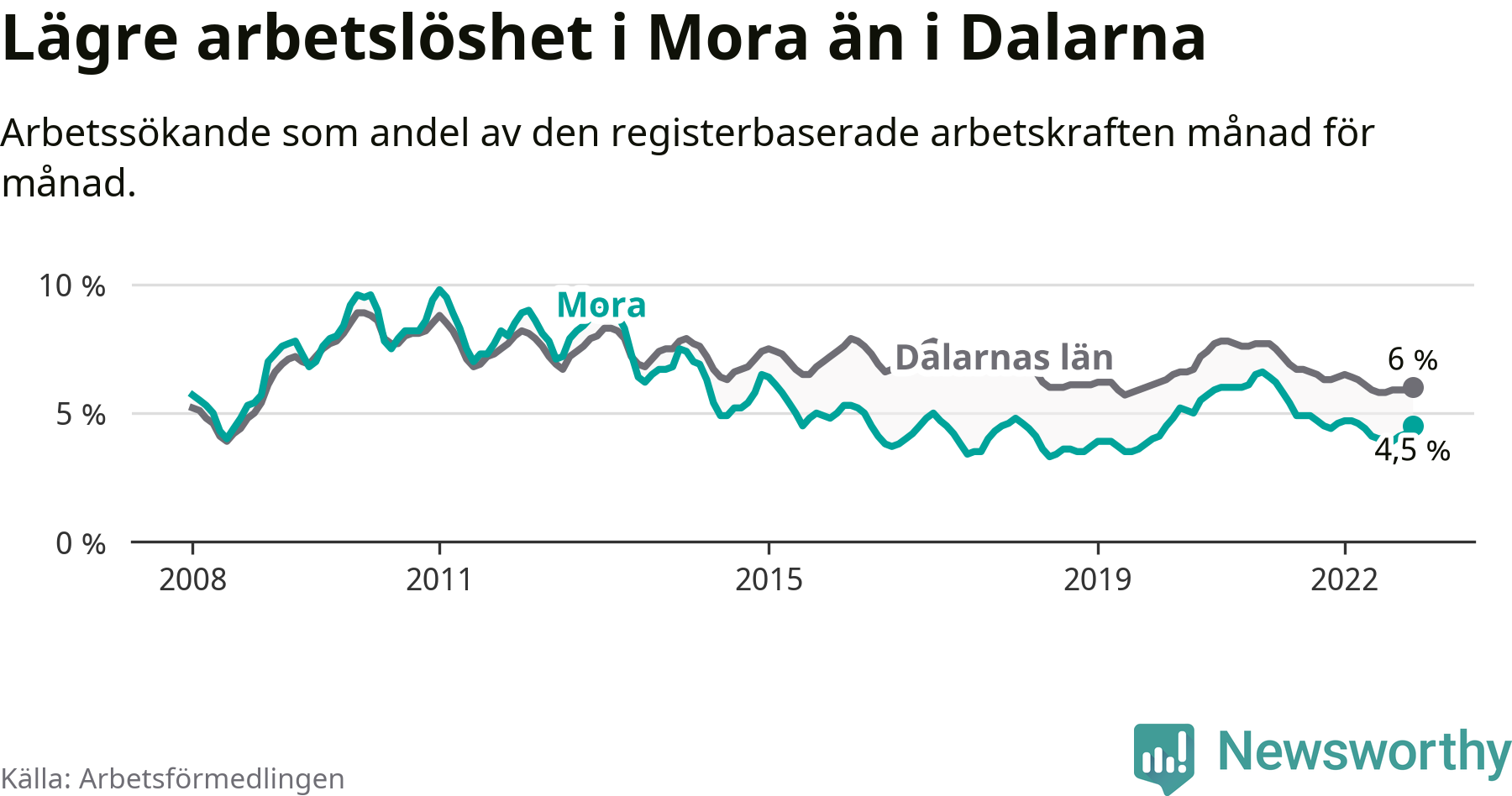 Även om arbetslösheten i Mora alltså ökar, så ligger den fortfarande under snittet i hela Dalarnas län (4,5 procent i kommunen, jämfört med 6,0 procent i hela länet). Gagnef har den lägsta arbetslösheten i länet (3,3 procent), medan Avesta har den högsta (8,6 procent). För att Mora skulle komma ner i samma arbetslöshetsnivå som Gagnef skulle 112 personer behöva sysselsättas.