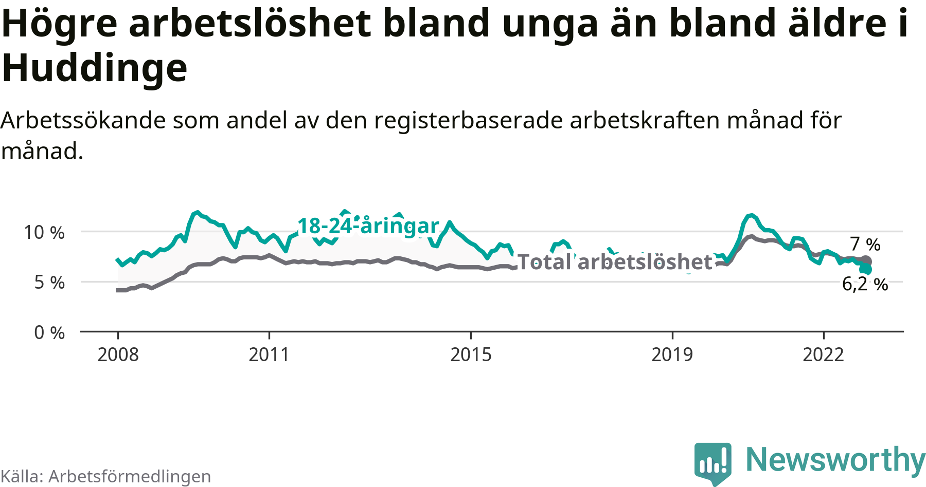 Medan Huddinge har högre total arbetslöshet än Stockholms län, ligger ungdomsarbetslösheten 0,7 procentenheter lägre i Huddinge.